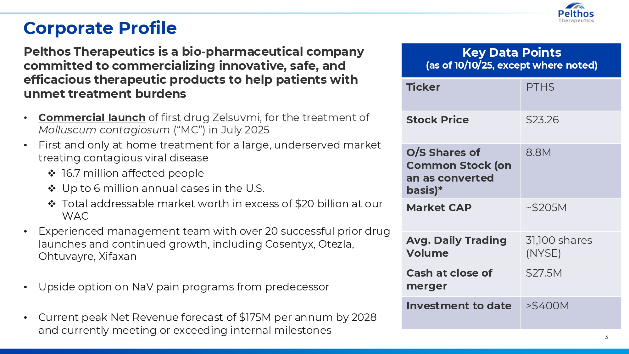 Legal Disclaimer This presentation of Pelthos Therapeutics Inc. (“we”, “us”, “our” or the “Company”) contains “forward-looking statements” within the meaning of the Private Securities Litigation Reform Act and other securities laws. Words such as “anticipate,” “believe,” “continue,” “could,” “estimate,” “expect,” “intend,” “may,” “plan,” “potential,” “predict, “project,” “seek,” “should,” “target,” “will,” “would” or similar expressions and the negatives of those term are intended to identify forward-looking statements. Forward-looking statements reflect management’s current expectations, are based on judgments and assumptions, are inherently uncertain and are subject to risks, uncertainties and other factors, which could cause the Company’s actual results, performance or achievements to differ materially from expected future results, performance or achievements expressed or implied in those forward-looking statements. Examples of these forward-looking statements and the related risks, uncertainties and other factors include, but are not limited to, the following: the success of the launch for Zesluvmi, timing, progress and results of any preclinical and clinical trials, its estimates regarding the potential market opportunity for Zelsuvmi, its ability to develop its pipeline, its ability to protect its intellectual property and enforce its intellectual property rights, and its ability to execute its development strategy and sustain its competitive position. Actual future results and trends may differ materially depending on a variety of factors, including, but not limited to, the Company’s limited operating history, the Company’s ability to establish its market development capabilities to commercialize its products and generate any revenue, and the Company’s ability to maintain regulatory approval of Zelsuvmi. Forward-looking statements are provided to allow potential investors the opportunity to understand management’s beliefs and opinions in respect of the future so that they may use such beliefs and opinions as one factor in evaluating an investment. These statements are not guarantees of future performance and undue reliance should not be placed on them. Any forward-looking statement in this presentation, in any related presentation supplement and in any related free writing presentation reflects our current view with respect to future events and is subject to these and other risks, uncertainties and assumptions relating to our business, results of operations, industry and future growth. You should read this presentation with the understanding that our actual future results may be materially different from any future results expressed or implied by these forward-looking statements. Except as required by law, we assume no obligation to update or revise these forward-looking statements for any reason, even if new information becomes available in the future. 2