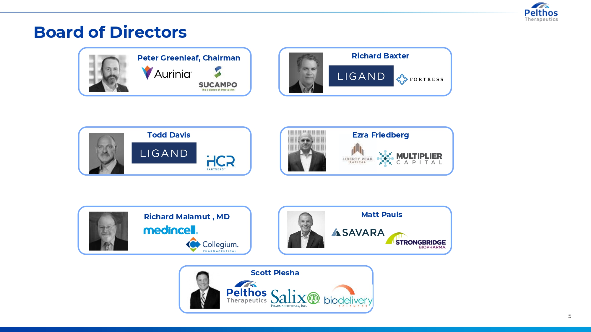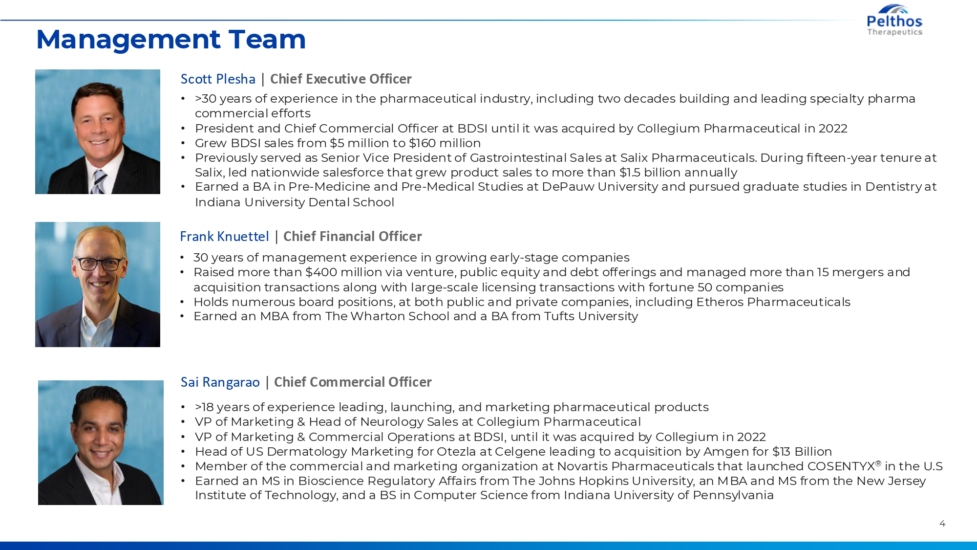 Management Team Scott Plesha | Chief Executive Officer • >30 years of experience in the pharmaceutical industry, including two decades building and leading specialty pharma commercial efforts • President and Chief Commercial Officer at BDSI until it was acquired by Collegium Pharmaceutical in 2022 • Grew BDSI sales from $5 million to $160 million • Previously served as Senior Vice President of Gastrointestinal Sales at Salix Pharmaceuticals. During fifteen-year tenure at Salix, led nationwide salesforce that grew product sales to more than $1.5 billion annually • Earned a BA in Pre-Medicine and Pre-Medical Studies at DePauw University and pursued graduate studies in Dentistry at Indiana University Dental School Frank Knuettel | Chief Financial Officer • 30 years of management experience in growing early-stage companies • Raised more than $400 million via venture, public equity and debt offerings and managed more than 15 mergers and acquisition transactions along with large-scale licensing transactions with fortune 50 companies • Holds numerous board positions, at both public and private companies, including Etheros Pharmaceuticals • Earned an MBA from The Wharton School and a BA from Tufts University Sai Rangarao | Chief Commercial Officer • • • • • • >18 years of experience leading, launching, and marketing pharmaceutical products VP of Marketing & Head of Neurology Sales at Collegium Pharmaceutical VP of Marketing & Commercial Operations at BDSI, until it was acquired by Collegium in 2022 Head of US Dermatology Marketing for Otezla at Celgene leading to acquisition by Amgen for $13 Billion Member of the commercial and marketing organization at Novartis Pharmaceuticals that launched COSENTYX® in the U.S Earned an MS in Bioscience Regulatory Affairs from The Johns Hopkins University, an MBA and MS from the New Jersey Institute of Technology, and a BS in Computer Science from Indiana University of Pennsylvania 4