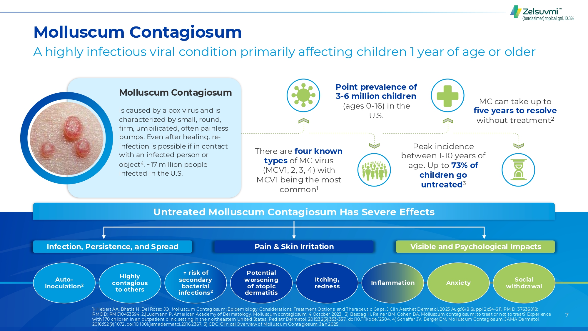Molluscum Contagiosum A highly infectious viral condition primarily affecting children 1 year of age or older Point prevalence of 3-6 million children (ages 0-16) in the U.S. Molluscum Contagiosum is caused by a pox virus and is characterized by small, round, firm, umbilicated, often painless bumps. Even after healing, reinfection is possible if in contact with an infected person or object4. ~17 million people infected in the U.S. There are four known types of MC virus (MCV1, 2, 3, 4) with MCV1 being the most common1 MC can take up to five years to resolve without treatment2 Peak incidence between 1-10 years of age. Up to 73% of children go untreated3 Untreated Molluscum Contagiosum Has Severe Effects Infection, Persistence, and Spread Autoinoculation2 Highly contagious to others Pain & Skin Irritation ↑ risk of secondary bacterial infections2 Potential worsening of atopic dermatitis Itching, redness Visible and Psychological Impacts Inflammation Anxiety Social withdrawal 1) Hebert AA, Bhatia N, Del Rosso JQ. Mollu scu m Contagiosu m: Epidemiology, Considerations, Treatment Options, and Therapeutic Gaps. J Clin Aesthet Dermatol. 20 23 Au g;16(8 Su ppl 2):S4-S11. PMID: 3 7636018; PMCID: PMC10453 394. 2.)Ludmann P. American Academy of Dermatology. Mollu sc um c on tagiosu m. 4 Oc tober 2023 . 3) Basdag H, Rainer BM, Cohen BA. Mollusc um c ontagiosu m: to treat or not to treat? Experience with 170 children in an outpatient c linic setting in the northeastern United States. Pediatr Dermatol. 20 15;32(3):353-35 7. doi:10.1111/pde.125 04. 4) Sch affer JV, Berger E M. Mollusc um Contagiosum. JAMA Dermatol. 20 16;152(9):1072. doi:10.1001/jamadermatol.2016.2367. 5) CDC. Clinical Overview of Mollusc um Contagiosum. Jan 2025 7