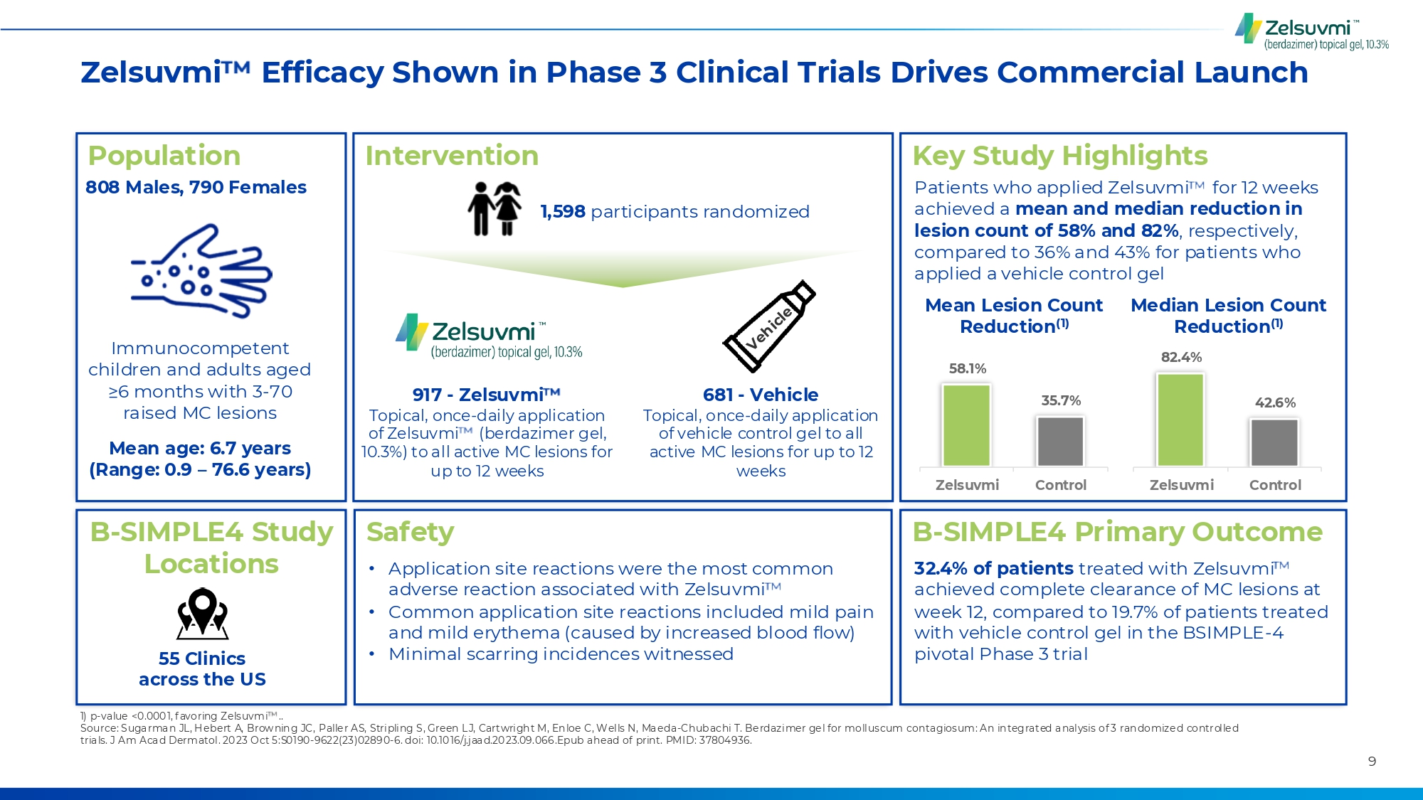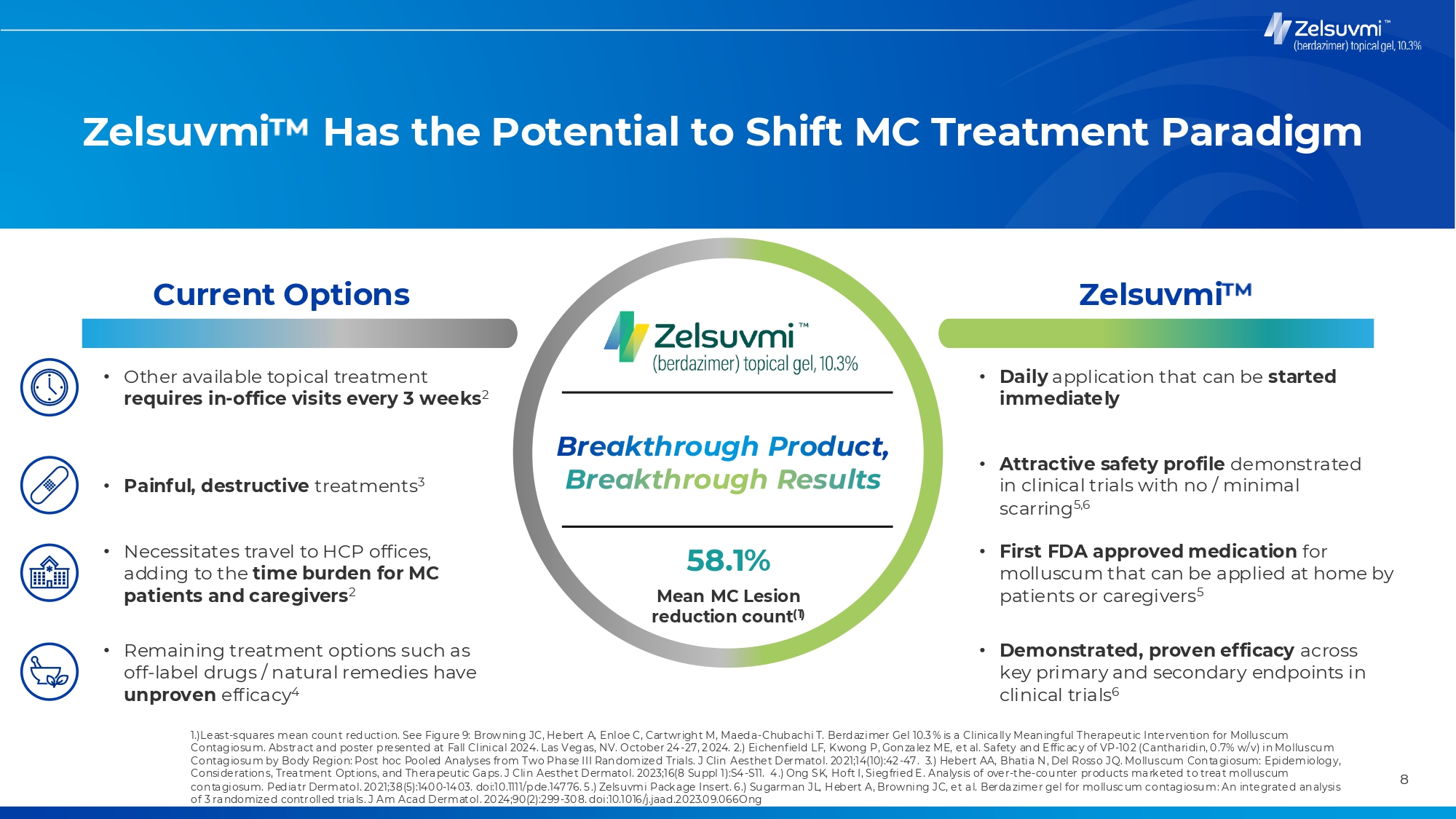 Zelsuvmi Has the Potential to Shift MC Treatment Paradigm Current Options Zelsuvmi • Other available topical treatment requires in-office visits every 3 weeks2 • Painful, destructive treatments3 • Necessitates travel to HCP offices, adding to the time burden for MC patients and caregivers2 • Remaining treatment options such as off-label drugs / natural remedies have unproven efficacy4 • Daily application that can be started immediately Breakthrough Product, Breakthrough Results 58.1% Mean MC Lesion reduction count(1) • Attractive safety profile demonstrated in clinical trials with no / minimal scarring5,6 • First FDA approved medication for molluscum that can be applied at home by patients or caregivers5 • Demonstrated, proven efficacy across key primary and secondary endpoints in clinical trials6 1.)Least-squares mean coun t reduction. See Figure 9: Brow nin g JC, Hebert A, Enloe C, Cartwrigh t M, Maeda-Chub ac hi T. Berdazimer Gel 10.3 % is a Clinically Meaningful Therapeutic Intervention for Mollu sc um Contagiosu m. Abstract and poster presented at Fall Clinical 2024. Las Vegas, NV. October 24 -27, 2024. 2.) Eichenf ield LF, Kwong P, Gonzalez ME, et al. Safety and E ffic ac y of VP-10 2 (Cantharidin, 0 .7% w/ v) in Molluscu m Contagiosu m by Body Region: Post hoc Pooled Analyses from Two Phase III Ran domized Trials. J Clin Aesthet Dermatol. 20 21;14(10):42-47. 3.) Hebert AA, Bhatia N, Del Rosso JQ. Molluscum Contagiosum: Epidemiology, Considerations, Treatment Options, and Therapeutic Gaps. J Clin Aesthet Dermatol. 20 23;16(8 Su ppl 1):S4-S11. 4 .) Ong SK, Hoft I, Siegfried E . Analysis of over-the-cou nter products marketed to treat molluscum con tagiosum. Pediatr Dermatol. 20 21;3 8(5):140 0-14 03. doi:10.1111/pde.14776. 5 .) Zelsuvmi Package Insert. 6.) Su garman JL, Hebert A, Browning JC, et al. Berdazimer gel for mollusc um c ontagiosu m: An integrated an alysis of 3 randomized controlled trials. J Am Acad Dermatol. 20 24;90(2):299-30 8. doi:10.1016/j.jaad.2023.0 9.066Ong 8