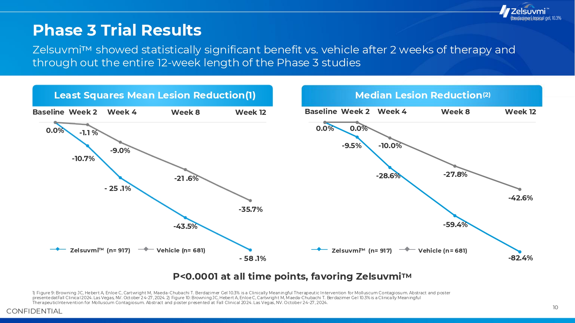 Phase 3 Trial Results Zelsuvmi showed statistically significant benefit vs. vehicle after 2 weeks of therapy and through out the entire 12-week length of the Phase 3 studies Least Squares Mean Lesion Reduction(1) Baseline Week 2 0.0% Week 4 Week 8 Week 12 Baseline Week 2 0.0% -1.1 % -10.7% Median Lesion Reduction(2) Week 8 Week 12 0.0% -9.5% -9.0% Week 4 -10.0% -28.6% -21 .6% -27.8% - 25 .1% -42.6% -35.7% -59.4% -43.5% Zelsuvmi (n= 917) Vehicle (n= 681) - 58 .1% Zelsuvmi (n= 917) Vehicle (n= 681) -82.4% P<0.0001 at all time points, favoring ZelsuvmiTM 1) Figure 9: Browning JC, Hebert A, Enloe C, Cartwright M, Maeda-Chubachi T. Berdazimer Gel 10.3% is a Clinically Mean in gful Therapeutic Intervention for Molluscum Contagiosu m. Abstract and poster presentedatFall Clinical 2024. Las Vegas, NV. October 24-27, 2024. 2) Figure 10: Browning JC, Hebert A, Enloe C, Cartwright M, M aeda-Chubachi T. Berdazimer Gel 10.3% is a Clinically Meaningful Therapeu ticIntervention f or Mollu scum Contagiosum. Abstract and poster presen ted at Fall Clin ic al 20 24. Las Vegas, NV. Octobe r 24-27, 2024. CONFIDENTIAL 10