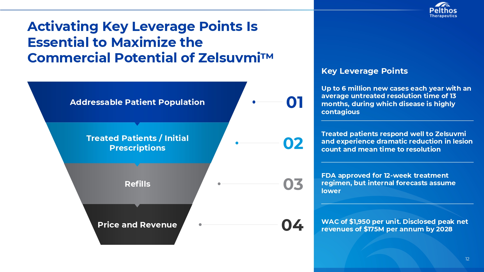 Activating Key Leverage Points Is Essential to Maximize the Commercial Potential of Zelsuvmi Key Leverage Points 01 Up to 6 million new cases each year with an average untreated resolution time of 13 months, during which disease is highly contagious 02 Treated patients respond well to Zelsuvmi and experience dramatic reduction in lesion count and mean time to resolution Refills 03 FDA approved for 12-week treatment regimen, but internal forecasts assume lower Price and Revenue 04 WAC of $1,950 per unit. Disclosed peak net revenues of $175M per annum by 2028 Addressable Patient Population Treated Patients / Initial Prescriptions 12