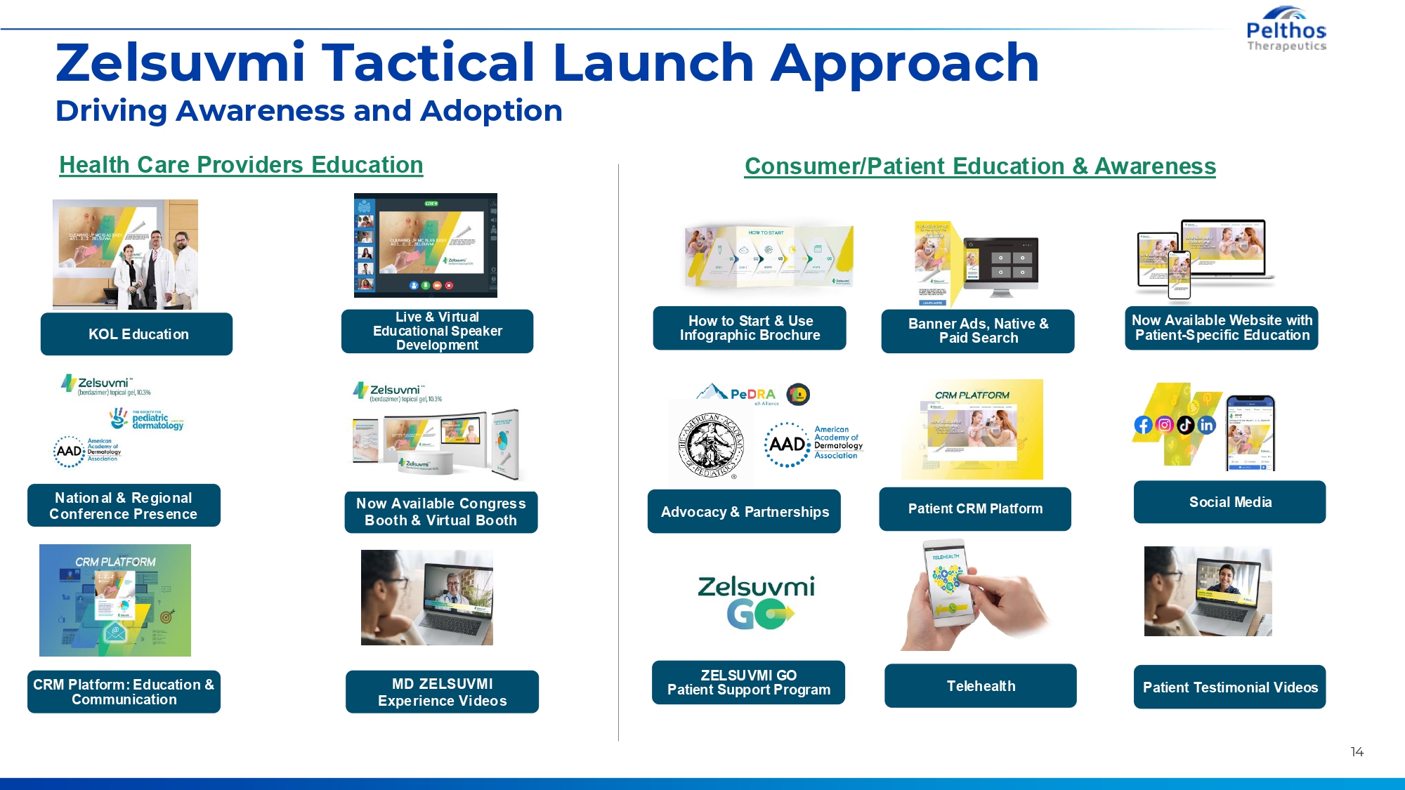 Zelsuvmi Tactical Launch Approach Driving Awareness and Adoption Health Care Providers Education KOL Education Live & Virtual Educational Speaker Development National & Regional Conference Presence Now Available Congress Booth & Virtual Booth CRM Platform: Education & Communication MD ZELSUVMI Experience Videos Consumer/Patient Education & Awareness How to Start & Use Infographic Brochure Advocacy & Partnerships ZELSUVMI GO Patient Support Program Banner Ads, Native & Paid Search Patient CRM Platform Telehealth Now Available Website with Patient-Specific Education Social Media Patient Testimonial Videos 14