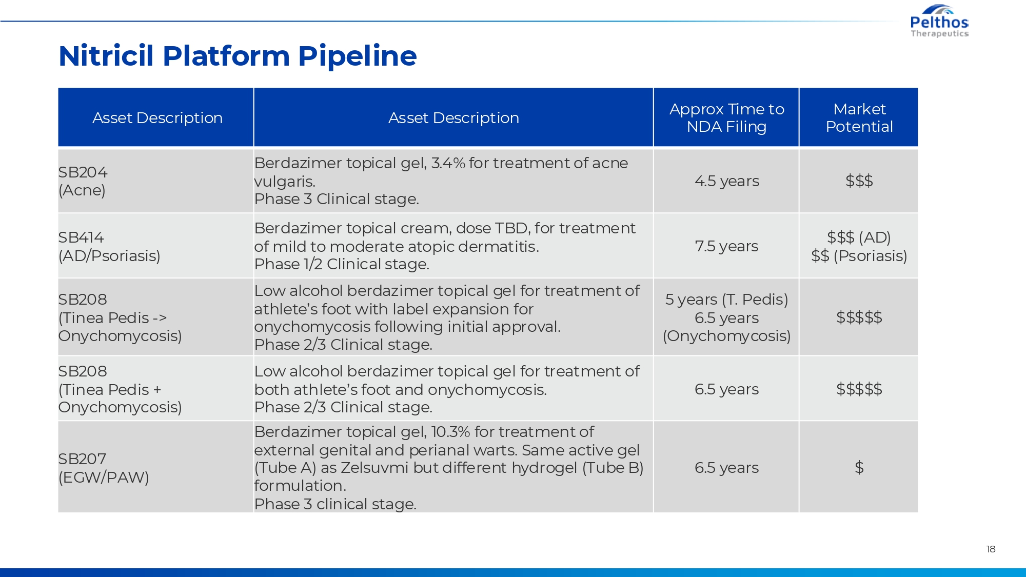 Nitricil Platform Pipeline Asset Description Asset Description Approx Time to NDA Filing Market Potential SB204 (Acne) Berdazimer topical gel, 3.4% for treatment of acne vulgaris. Phase 3 Clinical stage. 4.5 years $$$ SB414 (AD/Psoriasis) Berdazimer topical cream, dose TBD, for treatment of mild to moderate atopic dermatitis. Phase 1/2 Clinical stage. 7.5 years $$$ (AD) $$ (Psoriasis) SB208 (Tinea Pedis -> Onychomycosis) Low alcohol berdazimer topical gel for treatment of athlete’s foot with label expansion for onychomycosis following initial approval. Phase 2/3 Clinical stage. 5 years (T. Pedis) 6.5 years (Onychomycosis) $$$$$ SB208 (Tinea Pedis + Onychomycosis) Low alcohol berdazimer topical gel for treatment of both athlete’s foot and onychomycosis. Phase 2/3 Clinical stage. 6.5 years $$$$$ SB207 (EGW/PAW) Berdazimer topical gel, 10.3% for treatment of external genital and perianal warts. Same active gel (Tube A) as Zelsuvmi but different hydrogel (Tube B) formulation. Phase 3 clinical stage. 6.5 years $ 18