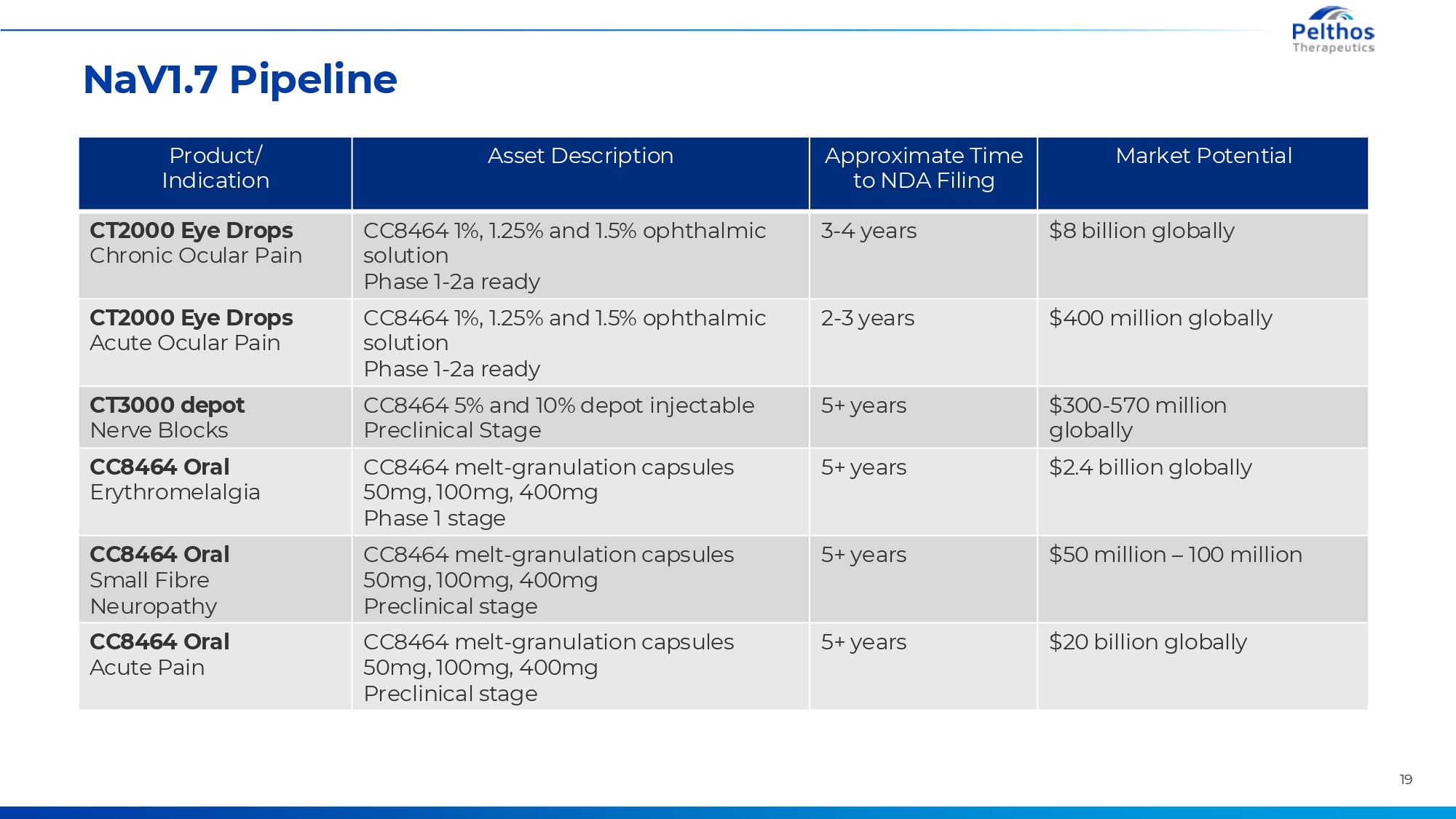 NaV1.7 Pipeline Product/ Indication Asset Description Approximate Time to NDA Filing Market Potential CT2000 Eye Drops Chronic Ocular Pain CC8464 1%, 1.25% and 1.5% ophthalmic solution Phase 1-2a ready 3-4 years $8 billion globally CT2000 Eye Drops Acute Ocular Pain CC8464 1%, 1.25% and 1.5% ophthalmic solution Phase 1-2a ready 2-3 years $400 million globally CT3000 depot Nerve Blocks CC8464 5% and 10% depot injectable Preclinical Stage 5+ years $300-570 million globally CC8464 Oral Erythromelalgia CC8464 melt-granulation capsules 50mg, 100mg, 400mg Phase 1 stage 5+ years $2.4 billion globally CC8464 Oral Small Fibre Neuropathy CC8464 melt-granulation capsules 50mg, 100mg, 400mg Preclinical stage 5+ years $50 million – 100 million CC8464 Oral Acute Pain CC8464 melt-granulation capsules 50mg, 100mg, 400mg Preclinical stage 5+ years $20 billion globally 19