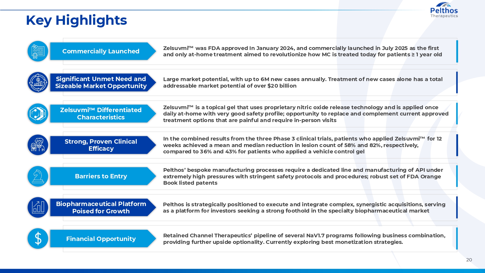 Key Highlights Commercially Launched Zelsuvmi was FDA approved In January 2024, and commercially launched in July 2025 as the first and only at-home treatment aimed to revolutionize how MC is treated today for patients ≥ 1 year old Significant Unmet Need and Sizeable Market Opportunity Large market potential, with up to 6M new cases annually. Treatment of new cases alone has a total addressable market potential of over $20 billion Zelsuvmi Differentiated Characteristics Strong, Proven Clinical Efficacy CONFIDENTIAL Zelsuvmi is a topical gel that uses proprietary nitric oxide release technology and is applied once daily at-home with very good safety profile; opportunity to replace and complement current approved treatment options that are painful and require in-person visits In the combined results from the three Phase 3 clinical trials, patients who applied Zelsuvmi weeks achieved a mean and median reduction in lesion count of 58% and 82%, respectively, compared to 36% and 43% for patients who applied a vehicle control gel for 12 Barriers to Entry Pelthos’ bespoke manufacturing processes require a dedicated line and manufacturing of API under extremely high pressures with stringent safety protocols and procedures; robust set of FDA Orange Book listed patents Biopharmaceutical Platform Poised for Growth Pelthos is strategically positioned to execute and integrate complex, synergistic acquisitions, serving as a platform for investors seeking a strong foothold in the specialty biopharmaceutical market Financial Opportunity Retained Channel Therapeutics’ pipeline of several NaV1.7 programs following business combination, providing further upside optionality. Currently exploring best monetization strategies. 20