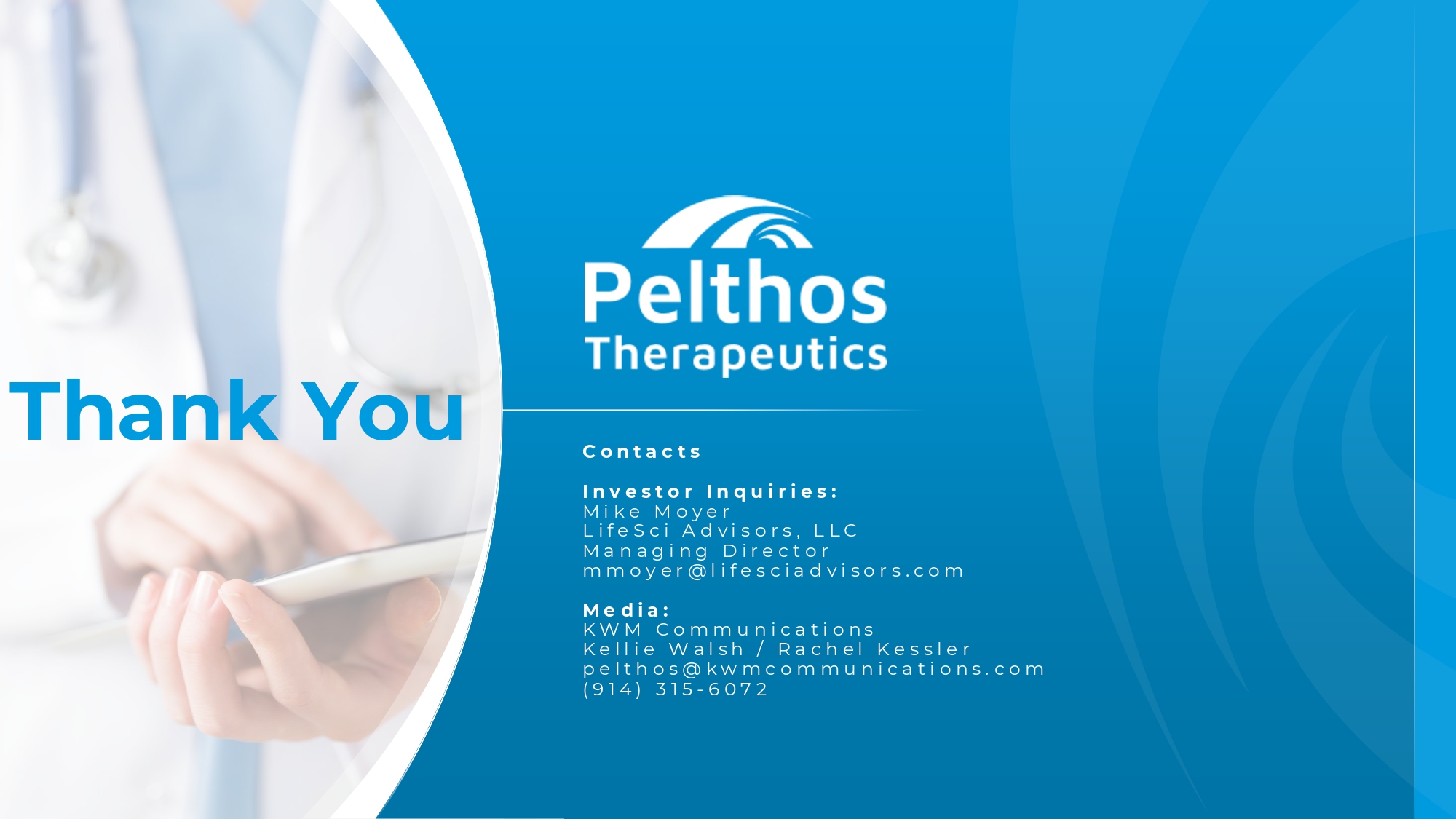 Thank You Contacts Investor Inquiries: Mi ke M oyer L ife Sci A dvi sors, L LC Ma n agi ng Dire ct or mmoy er @l ife s cia d vi sor s .com Me dia : KW M Commu n ica ti ons Ke ll ie W al sh / Ra ch el Ke s s le r p e lth os @ kwmcommu n ica ti ons . com (914) 315-607 2 21