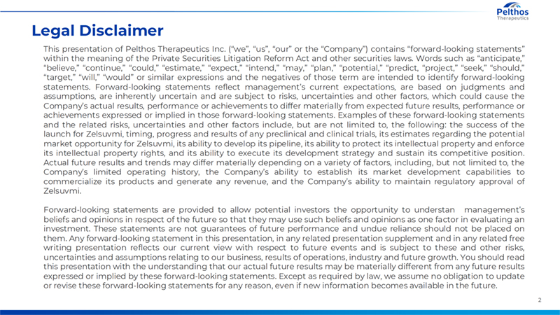 2 Legal Disclaimer This presentation of Pelthos Therapeutics Inc. (“we”, “us”, “our” or the “Company”) contains “forward-looking statements” within the meaning of the Private Securities Litigation Reform Act and other securities laws. Words such as “anticipate,” “believe,” “continue,” “could,” “estimate,” “expect,” “intend,” “may,” “plan,” “potential,” “predict, “project,” “seek,” “should,” “target,” “will,” “would” or similar expressions and the negatives of those term are intended to identify forward-looking statements. Forward-looking statements reflect management’s current expectations, are based on judgments and assumptions, are inherently uncertain and are subject to risks, uncertainties and other factors, which could cause the Company’s actual results, performance or achievements to differ materially from expected future results, performance or achievements expressed or implied in those forward-looking statements. Examples of these forward-looking statements and the related risks, uncertainties and other factors include, but are not limited to, the following: the success of the launch for Zelsuvmi, timing, progress and results of any preclinical and clinical trials, its estimates regarding the potential market opportunity for Zelsuvmi, its ability to develop its pipeline, its ability to protect its intellectual property and enforce its intellectual property rights, and its ability to execute its development strategy and sustain its competitive position. Actual future results and trends may differ materially depending on a variety of factors, including, but not limited to, the Company’s limited operating history, the Company’s ability to establish its market development capabilities to commercialize its products and generate any revenue, and the Company’s ability to maintain regulatory approval of Zelsuvmi. Forward-looking statements are provided to allow potential investors the opportunity to understand management’s beliefs and opinions in respect of the future so that they may use such beliefs and opinions as one factor in evaluating an investment. These statements are not guarantees of future performance and undue reliance should not be placed on them. Any forward-looking statement in this presentation, in any related presentation supplement and in any related free writing presentation reflects our current view with respect to future events and is subject to these and other risks, uncertainties and assumptions relating to our business, results of operations, industry and future growth. You should read this presentation with the understanding that our actual future results may be materially different from any future results expressed or implied by these forward-looking statements. Except as required by law, we assume no obligation to update or revise these forward-looking statements for any reason, even if new information becomes available in the future.
