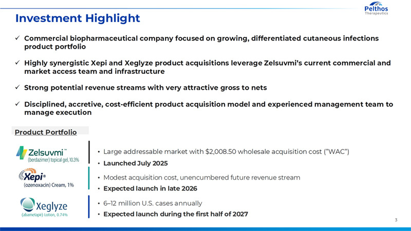 2 Legal Disclaimer This presentation of Pelthos Therapeutics Inc. (“we”, “us”, “our” or the “Company”) contains “forward-looking statements” within the meaning of the Private Securities Litigation Reform Act and other securities laws. Words such as “anticipate,” “believe,” “continue,” “could,” “estimate,” “expect,” “intend,” “may,” “plan,” “potential,” “predict, “project,” “seek,” “should,” “target,” “will,” “would” or similar expressions and the negatives of those term are intended to identify forward-looking statements. Forward-looking statements reflect management’s current expectations, are based on judgments and assumptions, are inherently uncertain and are subject to risks, uncertainties and other factors, which could cause the Company’s actual results, performance or achievements to differ materially from expected future results, performance or achievements expressed or implied in those forward-looking statements. Examples of these forward-looking statements and the related risks, uncertainties and other factors include, but are not limited to, the following: the success of the launch for Zelsuvmi, timing, progress and results of any preclinical and clinical trials, its estimates regarding the potential market opportunity for Zelsuvmi, its ability to develop its pipeline, its ability to protect its intellectual property and enforce its intellectual property rights, and its ability to execute its development strategy and sustain its competitive position. Actual future results and trends may differ materially depending on a variety of factors, including, but not limited to, the Company’s limited operating history, the Company’s ability to establish its market development capabilities to commercialize its products and generate any revenue, and the Company’s ability to maintain regulatory approval of Zelsuvmi. Forward-looking statements are provided to allow potential investors the opportunity to understand management’s beliefs and opinions in respect of the future so that they may use such beliefs and opinions as one factor in evaluating an investment. These statements are not guarantees of future performance and undue reliance should not be placed on them. Any forward-looking statement in this presentation, in any related presentation supplement and in any related free writing presentation reflects our current view with respect to future events and is subject to these and other risks, uncertainties and assumptions relating to our business, results of operations, industry and future growth. You should read this presentation with the understanding that our actual future results may be materially different from any future results expressed or implied by these forward-looking statements. Except as required by law, we assume no obligation to update or revise these forward-looking statements for any reason, even if new information becomes available in the future.