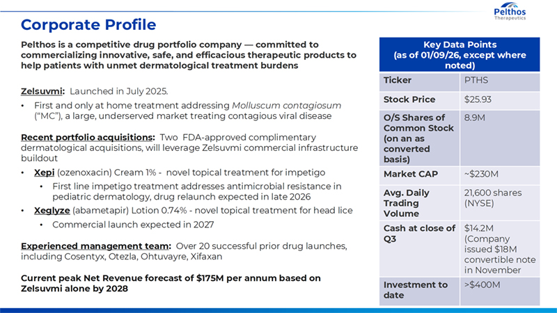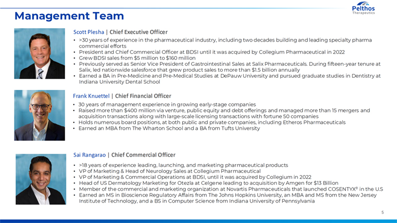 4 Corporate Profile Key Data Points (as of 01/09/26, except where noted) Ticker PTHS Stock Price $25.93 O/S Shares of Common Stock (on an as converted basis) 8.9M Market CAP ~$230M Avg. Daily Trading Volume 21,600 shares (NYSE) Cash at close of Q3 $14.2M (Company issued $18M convertible note in November Investment to date >$400M Pelthos is a competitive drug portfolio company — committed to commercializing innovative, safe, and efficacious therapeutic products to help patients with unmet dermatological treatment burdens Zelsuvmi: Launched in July 2025. • First and only at home treatment addressing Molluscum contagiosum (“MC”), a large, underserved market treating contagious viral disease Recent portfolio acquisitions: Two FDA-approved complimentary dermatological acquisitions, will leverage Zelsuvmi commercial infrastructure buildout • Xepi (ozenoxacin) Cream 1% - novel topical treatment for impetigo • First line impetigo treatment addresses antimicrobial resistance in pediatric dermatology, drug relaunch expected in late 2026 • Xeglyze (abametapir) Lotion 0.74% - novel topical treatment for head lice • Commercial launch expected in 2027 Experienced management team: Over 20 successful prior drug launches, including Cosentyx, Otezla, Ohtuvayre, Xifaxan Current peak Net Revenue forecast of $175M per annum based on Zelsuvmi alone by 2028