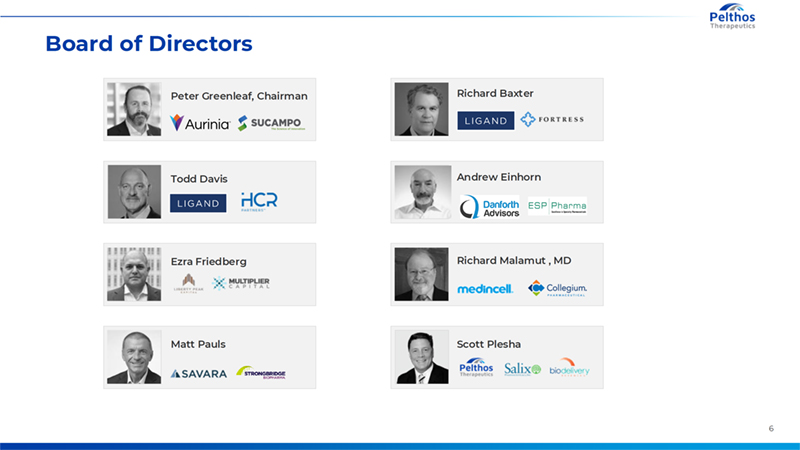 5 Management Team Frank Knuettel | Chief Financial Officer Sai Rangarao | Chief Commercial Officer Scott Plesha | Chief Executive Officer • 30 years of management experience in growing early-stage companies • Raised more than $400 million viaventure, public equity and debt offerings and managed more than 15 mergersand acquisition transactions along with large-scale licensing transactions with fortune 50companies • Holds numerous board positions, at both public andprivate companies, including Etheros Pharmaceuticals • Earned an MBA from The Wharton School and a BA from Tufts University • >30 years of experience in the pharmaceutical industry, including two decades building andleading specialty pharma commercial efforts • President and Chief Commercial Officer at BDSI until it was acquired by Collegium Pharmaceutical in 2022 • Grew BDSI sales from $5 million to $160 million • Previously served as Senior Vice President of Gastrointestinal Sales at SalixPharmaceuticals. During fifteen-year tenure at Salix, led nationwide salesforce that grew product sales to more than $1.5 billion annually • Earned a BA inPre-Medicine and Pre-Medical Studies at DePauw University and pursued graduatestudies in Dentistry at Indiana University Dental School • >18 years of experience leading, launching, and marketing pharmaceutical products • VP of Marketing & Head of Neurology Sales at Collegium Pharmaceutical • VP of Marketing & Commercial Operations at BDSI, until it was acquired by Collegium in 2022 • Head of US Dermatology Marketing for Otezla at Celgene leading to acquisition by Amgen for $13 Billion • Member of the commercial and marketing organization at Novartis Pharmaceuticals that launched COSENTYX®in the U.S • Earned an MS in Bioscience Regulatory Affairs from The Johns Hopkins University, an MBA and MS from the New Jersey Institute of Technology, and a BS in Computer Science from Indiana University of Pennsylvania