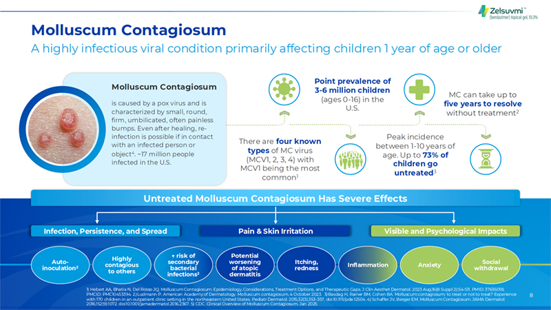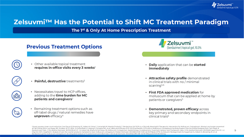 8 Molluscum Contagiosum A highly infectious viral condition primarily affecting children 1 year of age or older There are four known types of MC virus (MCV1, 2, 3, 4) with MCV1 being the most common1 Molluscum Contagiosum is caused by a pox virus and is characterized by small, round, firm, umbilicated, often painless bumps. Even after healing, re-infection is possible if in contact with an infected person or object4. ~17 million people infected in the U.S. MC can take up to five years to resolve without treatment2 Peak incidence between 1-10 years of age. Up to 73% of children go untreated3 Point prevalence of 3-6 million children (ages 0-16) in the U.S. Infection, Persistence, and Spread Visible and Psychological Impacts Pain & Skin Irritation Auto- inoculation2 Highly contagious to others ? risk of secondary bacterial infections2 Potential worsening of atopic dermatitis Itching, redness Inflammation Anxiety Social withdrawal Untreated Molluscum Contagiosum Has Severe Effects 1) Hebert AA, Bhatia N, Del Rosso JQ. Molluscum Contagiosum: Epidemiology, Considerations, Treatment Options, and Therapeutic Gaps. J Clin Aesthet Dermatol. 2023 Aug;16(8 Suppl 2):S4-S11. PMID: 37636018; PMCID: PMC10453394. 2.)Ludmann P. American Academy of Dermatology. Molluscum contagiosum. 4 October 2023. 3) Basdag H, Rainer BM, Cohen BA. Molluscum contagiosum: to treat or not to treat? Experience with 170 children in an outpatient clinic setting in the northeastern United States. Pediatr Dermatol. 2015;32(3):353-357. doi:10.1111/pde.12504. 4) Schaffer JV, Berger EM. Molluscum Contagiosum. JAMA Dermatol. 2016;152(9):1072. doi:10.1001/jamadermatol.2016.2367. 5) CDC. Clinical Overview of Molluscum Contagiosum. Jan 2025