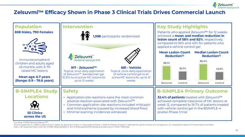 9 Zelsuvmi Has the Potential to Shift MC Treatment Paradigm Previous Treatment Options • Painful, destructive treatments3 • Attractive safety profile demonstrated in clinical trials with no / minimal scarring5,6 • Remaining treatment options such as off-label drugs / natural remedies have unproven efficacy4 • Demonstrated, proven efficacy across key primary and secondary endpoints in clinical trials6 • Necessitates travel to HCP offices, adding to the time burden for MC patients and caregivers2 • First FDA approved medication for molluscum that can be applied at home by patients or caregivers5 • Other available topical treatment requires in-office visits every 3 weeks2 • Daily application that can be started immediately 1.)Least-squares mean count reduction. See Figure 9: Browning JC, Hebert A, Enloe C, Cartwright M, Maeda-Chubachi T. Berdazimer Gel 10.3% is a Clinically Meaningful Therapeutic Intervention for Molluscum Contagiosum. Abstract and poster presented at Fal l Cl inical 2024. Las Vegas, NV. October 24-27, 2024. 2.) Eichenfield LF, Kwong P, Gonzalez ME, et al. Safety and Efficacy of VP-102 (Cantharidin, 0.7% w/v) in Molluscum Contagiosum by Body Region: Post hoc Pooled Analyses from Two Phase III Randomized Trials. J Clin Aesthet Dermatol. 2021;14(10):42-47. 3.) Hebert AA, Bhatia N, Del Rosso JQ. Molluscum Contagiosum: Epidemiology, Considerations, Treatment Options, and Therapeutic Gaps. J Cl in Aesthet Dermatol. 2023;16(8 Suppl 1):S4-S11. 4.) Ong SK, Hoft I, Siegfried E. Analysis of over-the-counter products marketed to treat molluscum contagiosum. Pediatr Dermatol . 2021;38(5):1400-1403. doi:10.1111/pde.14776. 5.) Zelsuvmi Package Insert. 6.) Sugarman JL, Hebert A, Browning JC, et al. Berdazimer gel for molluscum contagiosum: An integrated analysis of 3 randomized controlled trials. J Am Acad Dermatol. 2024;90(2):299-308. doi:10.1016/j.jaad.2023.09.066Ong The 1st & Only At Home Prescription Treatment