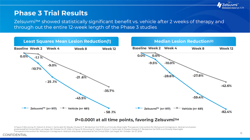 10 Intervention Population Key Study Highlights B-SIMPLE4 Primary Outcome B-SIMPLE4 Study Locations 1) p-value <0.0001, favoring Zelsuvmi .. Source: Sugarman JL, Hebert A, Browning JC, Paller AS, Stripling S, Green LJ, Cartwright M, Enloe C, Wells N, Maeda-Chubachi T. Berdazimer gel for molluscum contagiosum: An integrated analysis of 3 randomized controlled trials. J Am Acad Dermatol. 2023 Oct 5:S0190-9622(23)02890-6. doi: 10.1016/j.jaad.2023.09.066.Epub ahead of print. PMID: 37804936. Zelsuvmi Efficacy Shown in Phase 3 Clinical Trials Drives Commercial Launch 808 Males, 790 Females Immunocompetent children and adults aged =6 months with 3-70 raised MC lesions Mean age: 6.7 years (Range: 0.9 – 76.6 years) 1,598 participants randomized 917 - Zelsuvmi Topical, once-daily application of Zelsuvmi (berdazimer gel, 10.3%) to all active MC lesions for up to 12 weeks 681 - Vehicle Topical, once-daily application of vehicle control gel to all active MC lesions for up to 12 weeks Patients who applied Zelsuvmi for 12 weeks achieved a mean and median reduction in lesion count of 58% and 82%, respectively, compared to 36% and 43% for patients who applied a vehicle control gel Mean Lesion Count Reduction(1) 58.1% 35.7% Zelsuvmi Control 55 Clinics across the US 32.4% of patients treated with Zelsuvmi achieved complete clearance of MC lesions at week 12, compared to 19.7% of patients treated with vehicle control gel in the BSIMPLE-4 pivotal Phase 3 trial Median Lesion Count Reduction(1) 82.4% 42.6% Zelsuvmi Control Safety • Application site reactions were the most common adverse reaction associated with Zelsuvmi • Common application site reactions included mild pain and mild erythema (caused by increased blood flow) • Minimal scarring incidences witnessed
