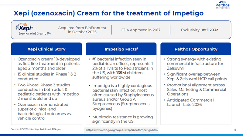Xepi(ozenoxacin) Cream for the treatment of Impetigo Sources: CDC Website, Xepi Pack Insert, FDA.gov Ozenoxacincream 1% developed as first line treatment in patients aged 2 months and older 15 clinical studies in Phase 1 & 2 conducted Two Pivotal Phase 3 studies conducted in both adult & pediatric patients with impetigo 2 months old and up Ozenoxacindemonstrated superior clinical and bacteriological outcomes vs. vehicle control XepiClinical Story #1 bacterial infection seen in pediatrician offices, represents 1-2% of all visits to Pediatricians in the US, with 135Mchildren suffering worldwide Impetigo is a highly contagious bacterial skin infection, most often caused by Staphylococcus aureus and/or Group A Streptococcus (Streptococcus pyogenes) Mupirocin resistance is growing significantly in the US Impetigo Facts1 Strong synergy with existing commercial infrastructure for Zelsuvmi Significant overlap between Xepi& Zelsuvmi HCP call points Promotional alignment across Sales, Marketing & Commercial Operations Anticipated Commercial Launch: Late 2026 Pelthos Opportunity Acquired from BioFrontera in October 2025 FDA Approved in 2017 Exclusivity until 2032 1https://www.cdc.gov/group-a-strep/about/impetigo.html 18
