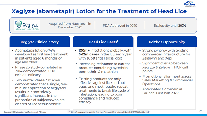 Xeglyze (abametapir) Lotion for the Treatment of Head Lice Sources: CDC Website, XepiPack Insert, FDA.gov Abametapirlotion 0.74% developed as first line treatment in patients aged 6 months of age and older Phase 2b study completed in 2014 demonstrated 100% ovicidal efficacy Two Pivotal Phase 3 studies demonstrated that a single, ten-minute application of Xeglyze® results in a statistically significant increase in the proportion of subjects who are cleared of lice versus vehicle. Xeglyze Clinical Story 100m+infestations globally, with 6-12m cases in the US, each year with substantial social cost Increasing resistance to current products containing pyrethrin, permethrin & malathion Existing products are only effective against lice and not eggs, and most require repeat treatments to break life cycle of infestation, leading to poor compliance and reduced efficacy Head Lice Facts1 Strong synergy with existing commercial infrastructure for Zelsuvmi and Xepi Significant overlap between Xeglyze& Zelsuvmi HCP call points Promotional alignment across Sales, Marketing & Commercial Operations Anticipated Commercial Launch: First half 2027 PelthosOpportunity Acquired from Hatchtech in December 2025 FDA Approved in 2020 Exclusivity until 2034 1https://www.accessdata.fda.gov/drugsatfda_docs/label/2017/208945lbl.pdf 20