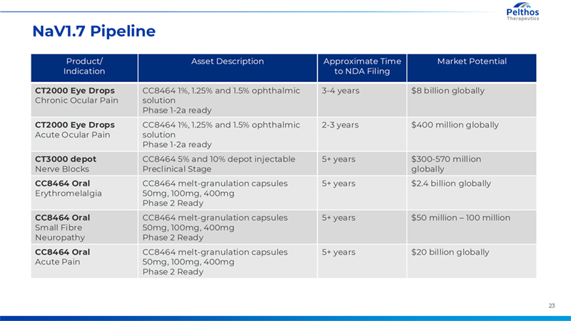 22 Nitricil Platform Pipeline* Asset Description Asset Description Approximate Time to NDA Filing Market Potential SB414 (AD/Psoriasis) Berdazimer topical cream, dose TBD, for treatment of mild to moderate atopic dermatitis. Phase 1/2 Clinical stage. 7.5 years $$$ (AD) $$ (Psoriasis) SB208 (Tinea Pedis -> Onychomycosis) Low alcohol berdazimer topical gel for treatment of athlete’s foot with label expansion for onychomycosis following initial approval. Phase 2/3 Clinical stage. 5 years (T. Pedis) 6.5 years (Onychomycosis) $$$$$ SB208 (Tinea Pedis + Onychomycosis) Low alcohol berdazimer topical gel for treatment of both athlete’s foot and onychomycosis. Phase 2/3 Clinical stage. 6.5 years $$$$$ SB207 (EGW/PAW) Berdazimer topical gel, 10.3% for treatment of external genital and perianal warts. Same active gel (Tube A) as Zelsuvmi but different hydrogel (Tube B) formulation. Phase 3 clinical stage. 6.5 years $ *Pelthos has contractual rights to SB207 and would need to enter into a separate license for other indications set forth herein