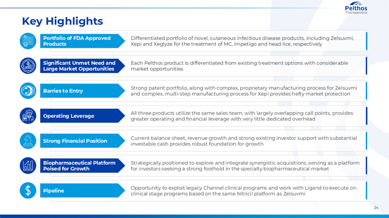 24 Operating Leverage All three products utilize the same sales team, with largely overlapping call points, provides greater operating and financial leverage with very little dedicated overhead Portfolio of FDA Approved Products Differentiated portfolio of novel, cutaneous infectious disease products, including Zelsuvmi, Xepi and Xeglyze for the treatment of MC, impetigo and head lice, respectively Barries to Entry Strong patent portfolio, along with complex, proprietary manufacturing process for Zelsuvmi and complex, multi-step manufacturing process for Xepi provides hefty market protection Significant Unmet Need and Large Market Opportunities Each Pelthos product is differentiated from existing treatment options with considerable market opportunities Strong Financial Position Current balance sheet, revenue growth and strong existing investor support with substantial investable cash provides robust foundation for growth Pipeline Opportunity to exploit legacy Channel clinical programs and work with Ligand to execute on clinical stage programs based on the same Nitricil platform as Zelsuvmi Biopharmaceutical Platform Poised for Growth Strategically positioned to explore and integrate synergistic acquisitions, serving as a platform for investors seeking a strong foothold in the specialty biopharmaceutical market Key Highlights