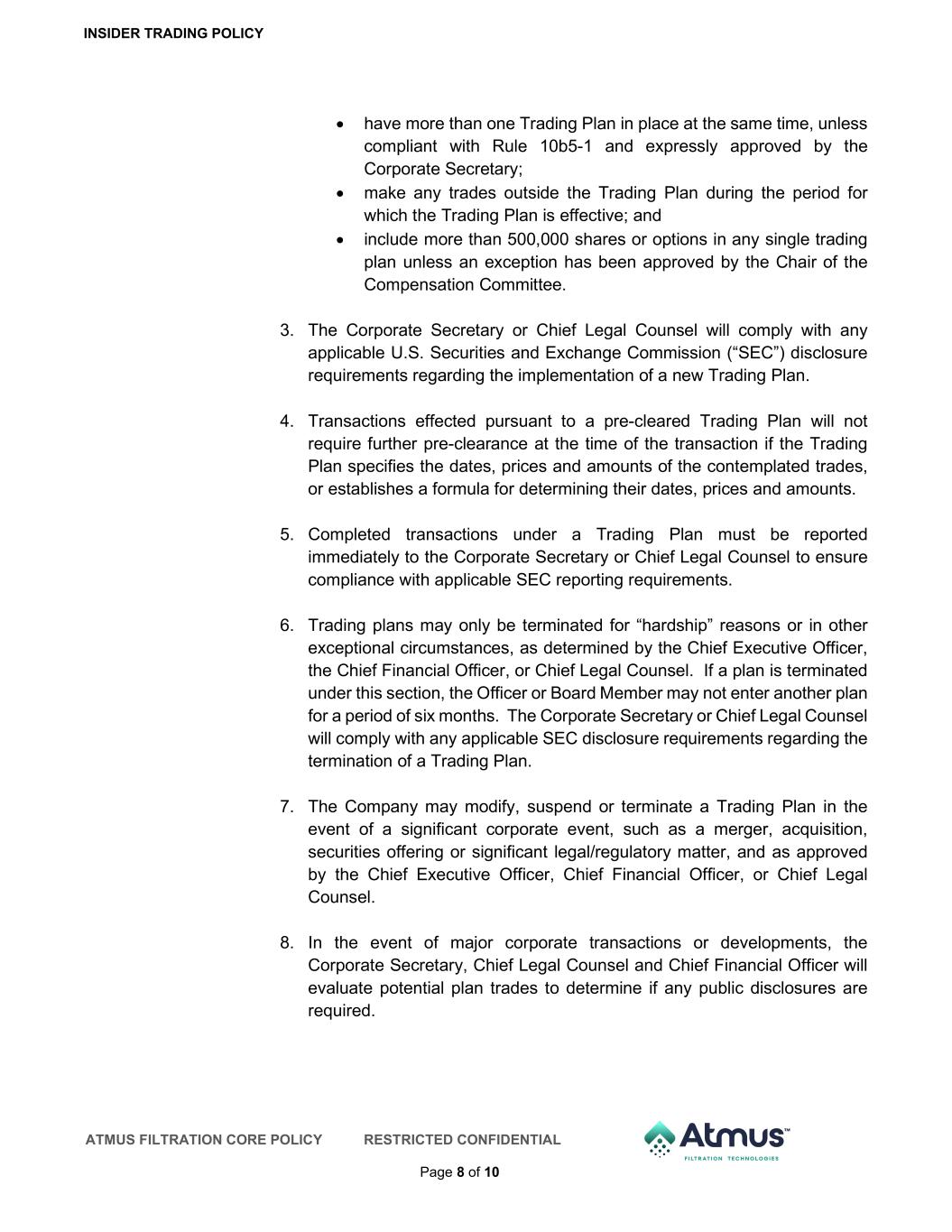 INSIDER TRADING POLICY ATMUS FILTRATION CORE POLICY RESTRICTED CONFIDENTIAL Page 8 of 10 have more than one Trading Plan in place at the same time, unless compliant with Rule 10b5-1 and expressly approved by the Corporate Secretary; make any trades outside the Trading Plan during the period for which the Trading Plan is effective; and include more than 500,000 shares or options in any single trading plan unless an exception has been approved by the Chair of the Compensation Committee. 3. The Corporate Secretary or Chief Legal Counsel will comply with any applicable U.S. Securities and Exchange Commission (“SEC”) disclosure requirements regarding the implementation of a new Trading Plan. 4. Transactions effected pursuant to a pre-cleared Trading Plan will not require further pre-clearance at the time of the transaction if the Trading Plan specifies the dates, prices and amounts of the contemplated trades, or establishes a formula for determining their dates, prices and amounts. 5. Completed transactions under a Trading Plan must be reported immediately to the Corporate Secretary or Chief Legal Counsel to ensure compliance with applicable SEC reporting requirements. 6. Trading plans may only be terminated for “hardship” reasons or in other exceptional circumstances, as determined by the Chief Executive Officer, the Chief Financial Officer, or Chief Legal Counsel. If a plan is terminated under this section, the Officer or Board Member may not enter another plan for a period of six months. The Corporate Secretary or Chief Legal Counsel will comply with any applicable SEC disclosure requirements regarding the termination of a Trading Plan. 7. The Company may modify, suspend or terminate a Trading Plan in the event of a significant corporate event, such as a merger, acquisition, securities offering or significant legal/regulatory matter, and as approved by the Chief Executive Officer, Chief Financial Officer, or Chief Legal Counsel. 8. In the event of major corporate transactions or developments, the Corporate Secretary, Chief Legal Counsel and Chief Financial Officer will evaluate potential plan trades to determine if any public disclosures are required.