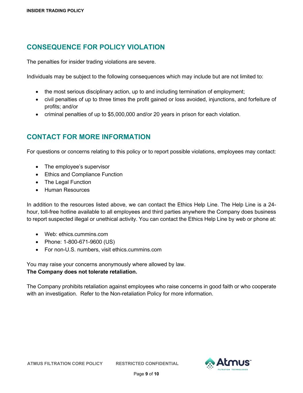 INSIDER TRADING POLICY ATMUS FILTRATION CORE POLICY RESTRICTED CONFIDENTIAL Page 9 of 10 CONSEQUENCE FOR POLICY VIOLATION The penalties for insider trading violations are severe. Individuals may be subject to the following consequences which may include but are not limited to: the most serious disciplinary action, up to and including termination of employment; civil penalties of up to three times the profit gained or loss avoided, injunctions, and forfeiture of profits; and/or criminal penalties of up to $5,000,000 and/or 20 years in prison for each violation. CONTACT FOR MORE INFORMATION For questions or concerns relating to this policy or to report possible violations, employees may contact: The employee’s supervisor Ethics and Compliance Function The Legal Function Human Resources In addition to the resources listed above, we can contact the Ethics Help Line. The Help Line is a 24- hour, toll-free hotline available to all employees and third parties anywhere the Company does business to report suspected illegal or unethical activity. You can contact the Ethics Help Line by web or phone at: Web: ethics.cummins.com Phone: 1-800-671-9600 (US) For non-U.S. numbers, visit ethics.cummins.com You may raise your concerns anonymously where allowed by law. The Company does not tolerate retaliation. The Company prohibits retaliation against employees who raise concerns in good faith or who cooperate with an investigation. Refer to the Non-retaliation Policy for more information.