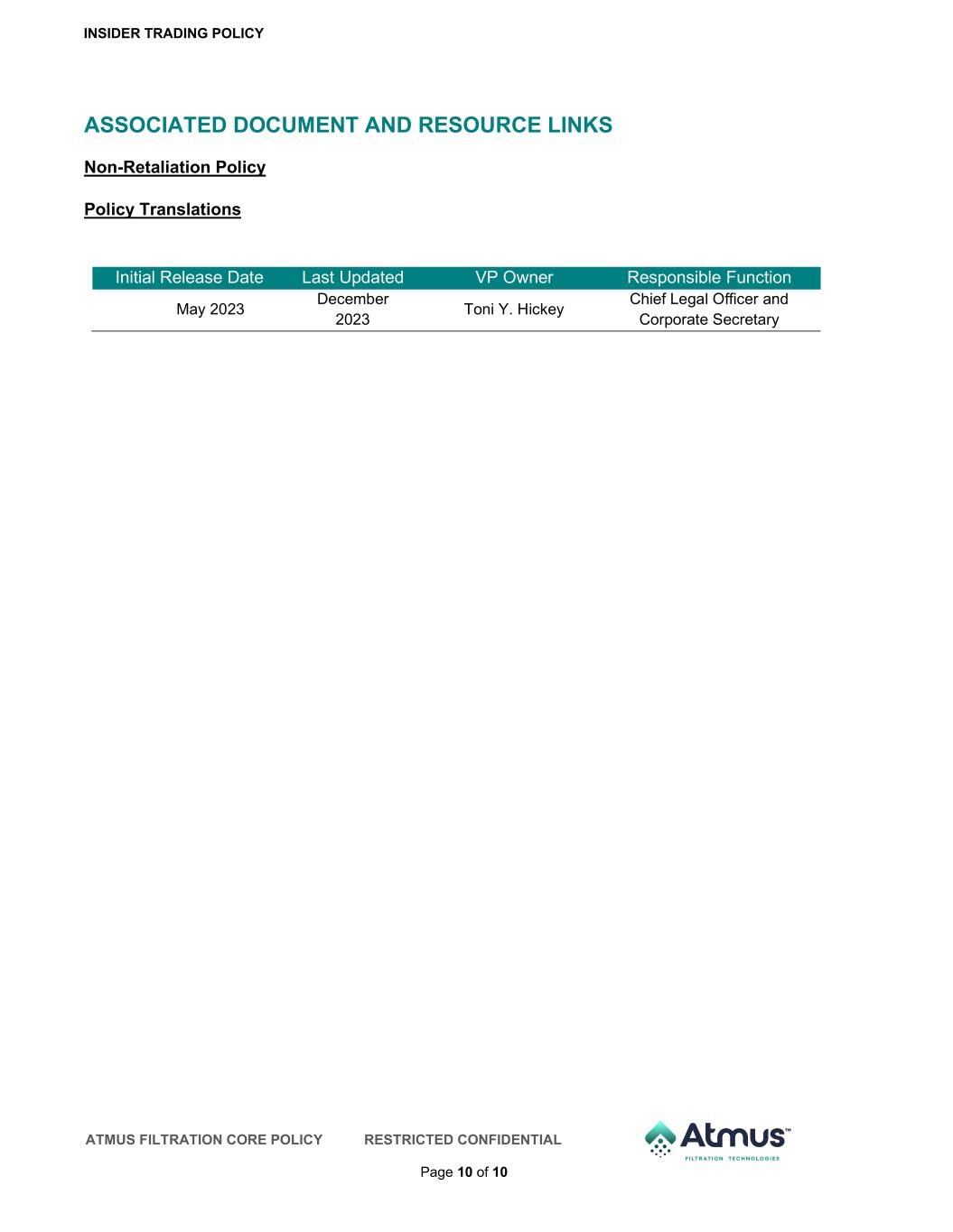 INSIDER TRADING POLICY ATMUS FILTRATION CORE POLICY RESTRICTED CONFIDENTIAL Page 10 of 10 ASSOCIATED DOCUMENT AND RESOURCE LINKS Non-Retaliation Policy Policy Translations Initial Release Date Last Updated VP Owner Responsible Function May 2023 December 2023 Toni Y. Hickey Chief Legal Officer and Corporate Secretary