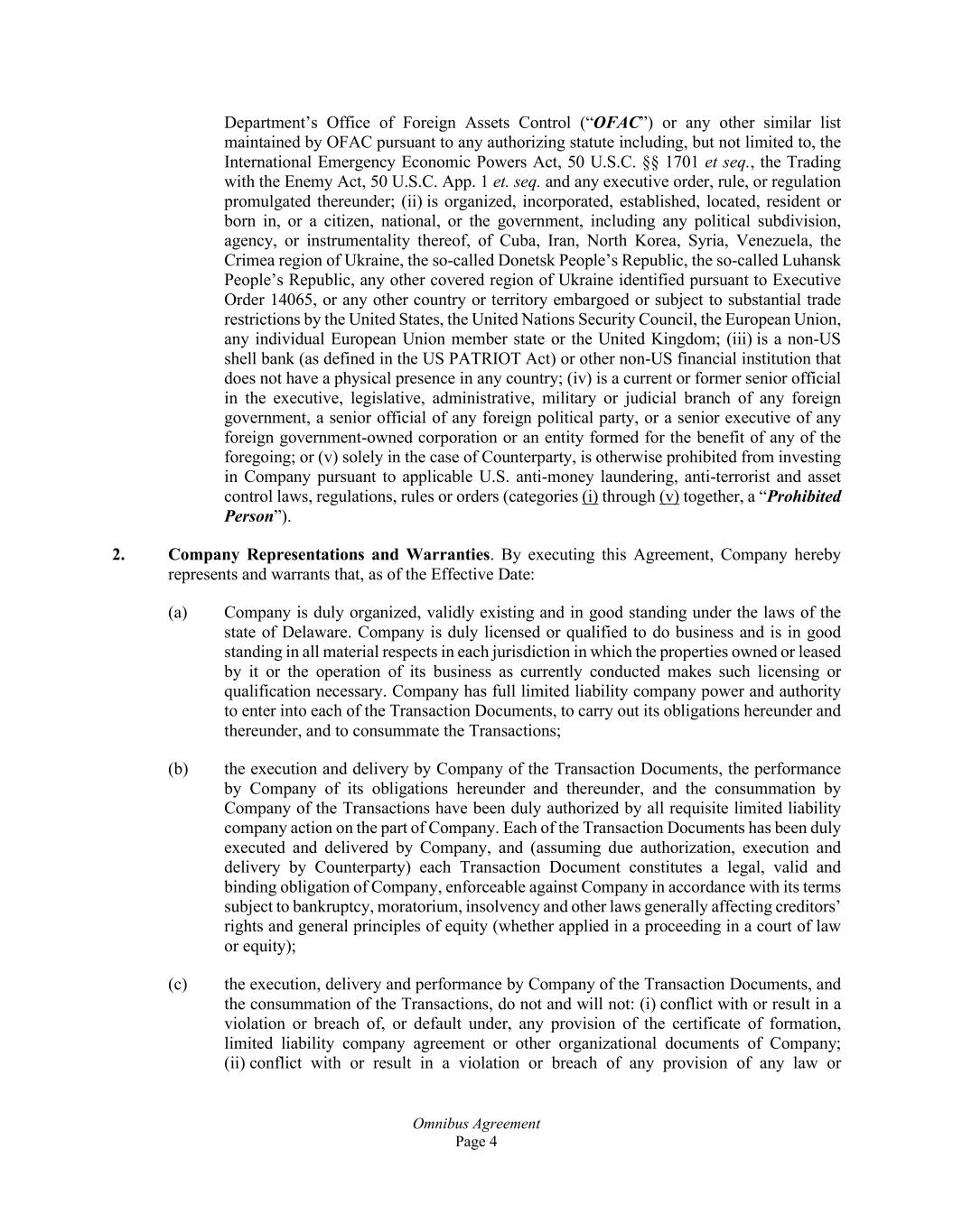 Omnibus Agreement Page 4 Department’s Office of Foreign Assets Control (“OFAC”) or any other similar list maintained by OFAC pursuant to any authorizing statute including, but not limited to, the International Emergency Economic Powers Act, 50 U.S.C. §§ 1701 et seq., the Trading with the Enemy Act, 50 U.S.C. App. 1 et. seq. and any executive order, rule, or regulation promulgated thereunder; (ii) is organized, incorporated, established, located, resident or born in, or a citizen, national, or the government, including any political subdivision, agency, or instrumentality thereof, of Cuba, Iran, North Korea, Syria, Venezuela, the Crimea region of Ukraine, the so-called Donetsk People’s Republic, the so-called Luhansk People’s Republic, any other covered region of Ukraine identified pursuant to Executive Order 14065, or any other country or territory embargoed or subject to substantial trade restrictions by the United States, the United Nations Security Council, the European Union, any individual European Union member state or the United Kingdom; (iii) is a non-US shell bank (as defined in the US PATRIOT Act) or other non-US financial institution that does not have a physical presence in any country; (iv) is a current or former senior official in the executive, legislative, administrative, military or judicial branch of any foreign government, a senior official of any foreign political party, or a senior executive of any foreign government-owned corporation or an entity formed for the benefit of any of the foregoing; or (v) solely in the case of Counterparty, is otherwise prohibited from investing in Company pursuant to applicable U.S. anti-money laundering, anti-terrorist and asset control laws, regulations, rules or orders (categories (i) through (v) together, a “Prohibited Person”). 2. Company Representations and Warranties. By executing this Agreement, Company hereby represents and warrants that, as of the Effective Date: (a) Company is duly organized, validly existing and in good standing under the laws of the state of Delaware. Company is duly licensed or qualified to do business and is in good standing in all material respects in each jurisdiction in which the properties owned or leased by it or the operation of its business as currently conducted makes such licensing or qualification necessary. Company has full limited liability company power and authority to enter into each of the Transaction Documents, to carry out its obligations hereunder and thereunder, and to consummate the Transactions; (b) the execution and delivery by Company of the Transaction Documents, the performance by Company of its obligations hereunder and thereunder, and the consummation by Company of the Transactions have been duly authorized by all requisite limited liability company action on the part of Company. Each of the Transaction Documents has been duly executed and delivered by Company, and (assuming due authorization, execution and delivery by Counterparty) each Transaction Document constitutes a legal, valid and binding obligation of Company, enforceable against Company in accordance with its terms subject to bankruptcy, moratorium, insolvency and other laws generally affecting creditors’ rights and general principles of equity (whether applied in a proceeding in a court of law or equity); (c) the execution, delivery and performance by Company of the Transaction Documents, and the consummation of the Transactions, do not and will not: (i) conflict with or result in a violation or breach of, or default under, any provision of the certificate of formation, limited liability company agreement or other organizational documents of Company; (ii) conflict with or result in a violation or breach of any provision of any law or