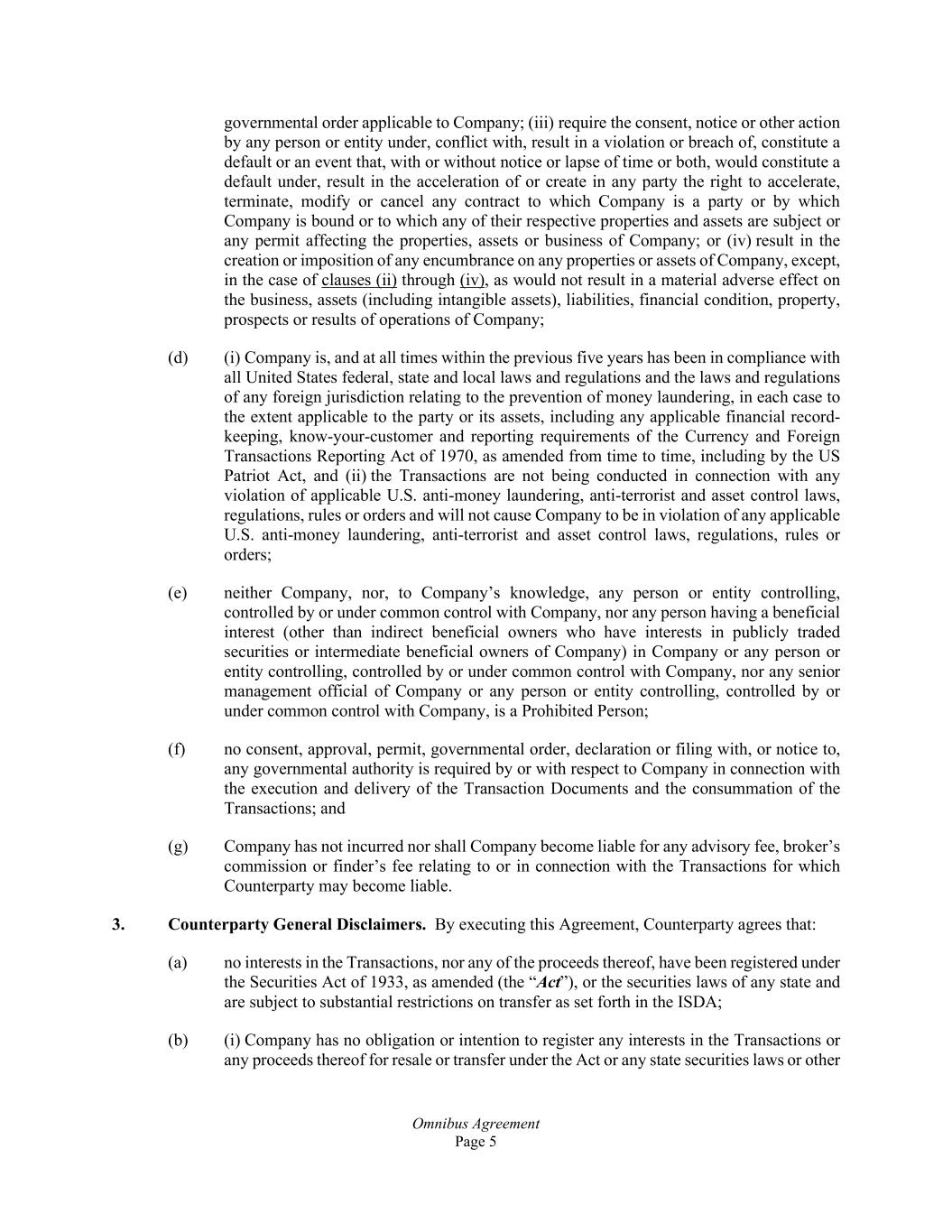 Omnibus Agreement Page 5 governmental order applicable to Company; (iii) require the consent, notice or other action by any person or entity under, conflict with, result in a violation or breach of, constitute a default or an event that, with or without notice or lapse of time or both, would constitute a default under, result in the acceleration of or create in any party the right to accelerate, terminate, modify or cancel any contract to which Company is a party or by which Company is bound or to which any of their respective properties and assets are subject or any permit affecting the properties, assets or business of Company; or (iv) result in the creation or imposition of any encumbrance on any properties or assets of Company, except, in the case of clauses (ii) through (iv), as would not result in a material adverse effect on the business, assets (including intangible assets), liabilities, financial condition, property, prospects or results of operations of Company; (d) (i) Company is, and at all times within the previous five years has been in compliance with all United States federal, state and local laws and regulations and the laws and regulations of any foreign jurisdiction relating to the prevention of money laundering, in each case to the extent applicable to the party or its assets, including any applicable financial record- keeping, know-your-customer and reporting requirements of the Currency and Foreign Transactions Reporting Act of 1970, as amended from time to time, including by the US Patriot Act, and (ii) the Transactions are not being conducted in connection with any violation of applicable U.S. anti-money laundering, anti-terrorist and asset control laws, regulations, rules or orders and will not cause Company to be in violation of any applicable U.S. anti-money laundering, anti-terrorist and asset control laws, regulations, rules or orders; (e) neither Company, nor, to Company’s knowledge, any person or entity controlling, controlled by or under common control with Company, nor any person having a beneficial interest (other than indirect beneficial owners who have interests in publicly traded securities or intermediate beneficial owners of Company) in Company or any person or entity controlling, controlled by or under common control with Company, nor any senior management official of Company or any person or entity controlling, controlled by or under common control with Company, is a Prohibited Person; (f) no consent, approval, permit, governmental order, declaration or filing with, or notice to, any governmental authority is required by or with respect to Company in connection with the execution and delivery of the Transaction Documents and the consummation of the Transactions; and (g) Company has not incurred nor shall Company become liable for any advisory fee, broker’s commission or finder’s fee relating to or in connection with the Transactions for which Counterparty may become liable. 3. Counterparty General Disclaimers. By executing this Agreement, Counterparty agrees that: (a) no interests in the Transactions, nor any of the proceeds thereof, have been registered under the Securities Act of 1933, as amended (the “Act”), or the securities laws of any state and are subject to substantial restrictions on transfer as set forth in the ISDA; (b) (i) Company has no obligation or intention to register any interests in the Transactions or any proceeds thereof for resale or transfer under the Act or any state securities laws or other