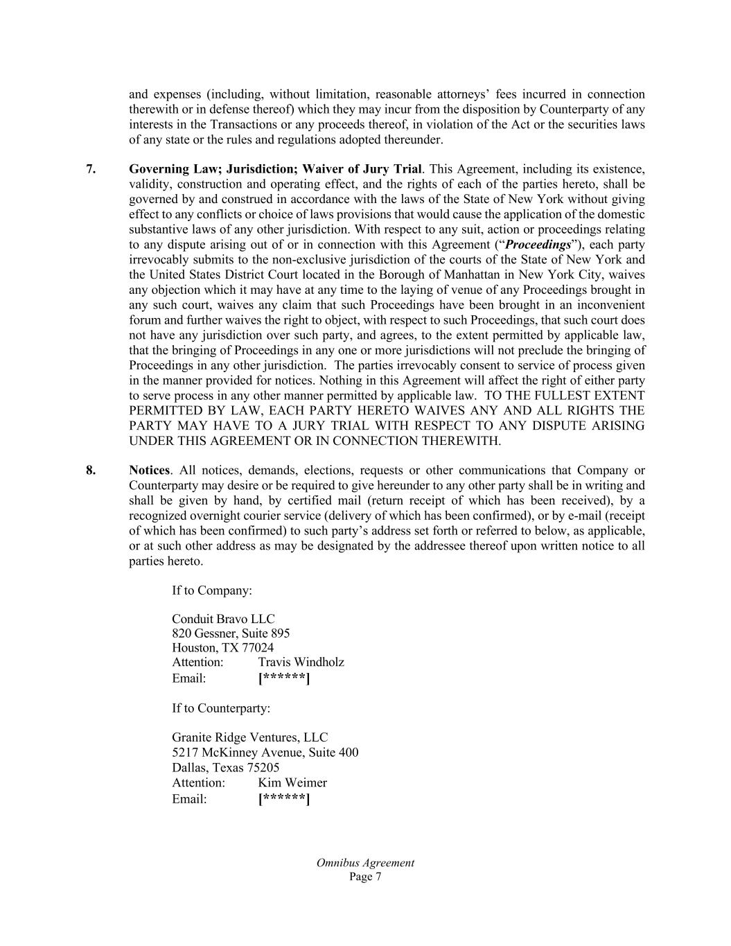 Omnibus Agreement Page 7 and expenses (including, without limitation, reasonable attorneys’ fees incurred in connection therewith or in defense thereof) which they may incur from the disposition by Counterparty of any interests in the Transactions or any proceeds thereof, in violation of the Act or the securities laws of any state or the rules and regulations adopted thereunder. 7. Governing Law; Jurisdiction; Waiver of Jury Trial. This Agreement, including its existence, validity, construction and operating effect, and the rights of each of the parties hereto, shall be governed by and construed in accordance with the laws of the State of New York without giving effect to any conflicts or choice of laws provisions that would cause the application of the domestic substantive laws of any other jurisdiction. With respect to any suit, action or proceedings relating to any dispute arising out of or in connection with this Agreement (“Proceedings”), each party irrevocably submits to the non-exclusive jurisdiction of the courts of the State of New York and the United States District Court located in the Borough of Manhattan in New York City, waives any objection which it may have at any time to the laying of venue of any Proceedings brought in any such court, waives any claim that such Proceedings have been brought in an inconvenient forum and further waives the right to object, with respect to such Proceedings, that such court does not have any jurisdiction over such party, and agrees, to the extent permitted by applicable law, that the bringing of Proceedings in any one or more jurisdictions will not preclude the bringing of Proceedings in any other jurisdiction. The parties irrevocably consent to service of process given in the manner provided for notices. Nothing in this Agreement will affect the right of either party to serve process in any other manner permitted by applicable law. TO THE FULLEST EXTENT PERMITTED BY LAW, EACH PARTY HERETO WAIVES ANY AND ALL RIGHTS THE PARTY MAY HAVE TO A JURY TRIAL WITH RESPECT TO ANY DISPUTE ARISING UNDER THIS AGREEMENT OR IN CONNECTION THEREWITH. 8. Notices. All notices, demands, elections, requests or other communications that Company or Counterparty may desire or be required to give hereunder to any other party shall be in writing and shall be given by hand, by certified mail (return receipt of which has been received), by a recognized overnight courier service (delivery of which has been confirmed), or by e-mail (receipt of which has been confirmed) to such party’s address set forth or referred to below, as applicable, or at such other address as may be designated by the addressee thereof upon written notice to all parties hereto. If to Company: Conduit Bravo LLC 820 Gessner, Suite 895 Houston, TX 77024 Attention: Travis Windholz Email: [******] If to Counterparty: Granite Ridge Ventures, LLC 5217 McKinney Avenue, Suite 400 Dallas, Texas 75205 Attention: Kim Weimer Email: [******]