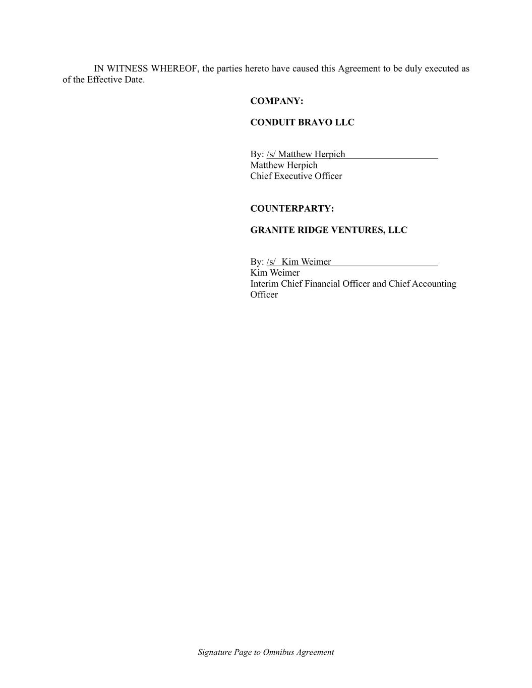 Signature Page to Omnibus Agreement IN WITNESS WHEREOF, the parties hereto have caused this Agreement to be duly executed as of the Effective Date. COMPANY: CONDUIT BRAVO LLC By: /s/ Matthew Herpich Matthew Herpich Chief Executive Officer COUNTERPARTY: GRANITE RIDGE VENTURES, LLC By: /s/ Kim Weimer Kim Weimer Interim Chief Financial Officer and Chief Accounting Officer