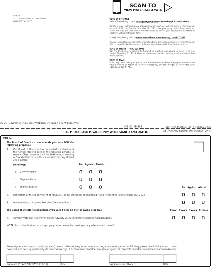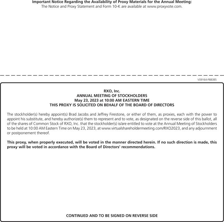 Admission: You are invited to attend the annual meeting of stockholders of RXO, Inc. The Annual Meeting will be a virtual meeting of stockholders. You will be able to attend the Annual Meeting at www.virtualshareholdermeeting.com/RXO2023. You will need to provide the control number on your proxy card to access the Annual Meeting. If the shares of common stock you hold are in an account at a broker, dealer, commercial bank, trust company or other nominee (i.e., in “street name”), you must register in advance to participate in the Annual Meeting, to vote electronically and to submit questions during the live webcast of the meeting. To register in advance, you must obtain a legal proxy from the bank, broker or other nominee that holds your shares, giving you the right to vote the shares. At the time of the meeting, go to www.virtualshareholdermeeting.com/RXO2023 and enter your control number.