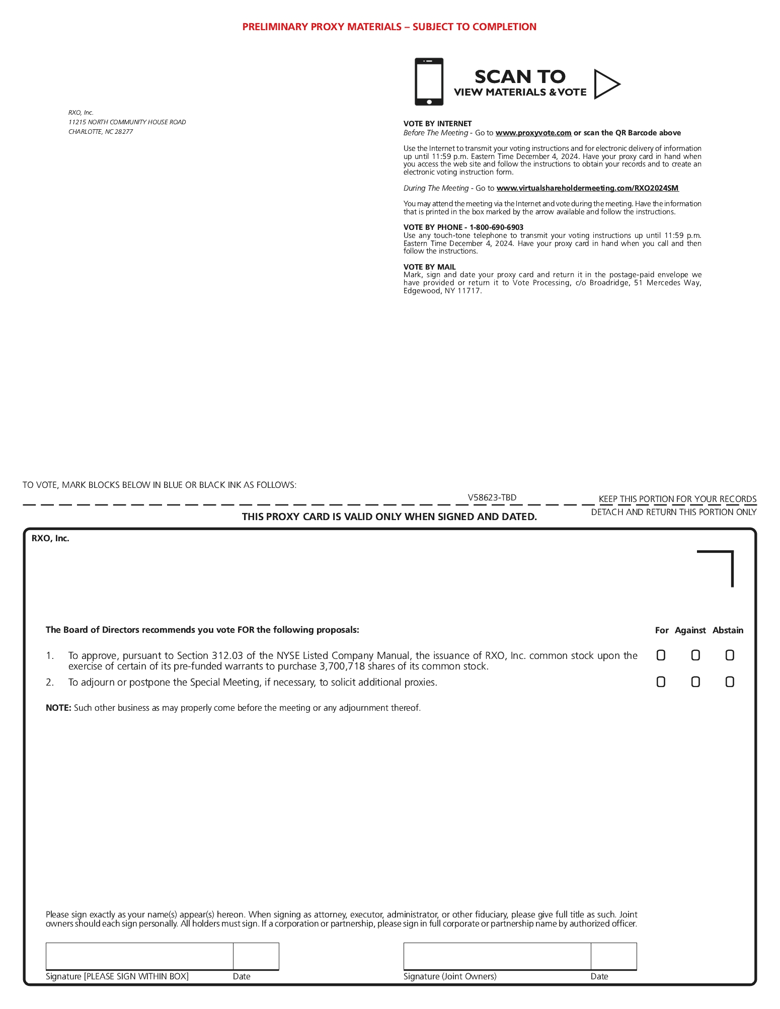 Holders of record may also revoke their proxies by attending the Special Meeting and voting during the live webcast at www.virtualshareholdermeeting.com/RXO2024SM, although attendance at the Special Meeting will not itself revoke a proxy. Any written notice of revocation or subsequent proxy should be sent so as to be delivered to Jeffrey Firestone, Corporate Secretary, RXO, Inc., 11215 North Community House Road, Charlotte, North Carolina 28277. Any written notice of revocation must be received at such address by 11:59 p.m., Eastern Time, on December 4, 2024.