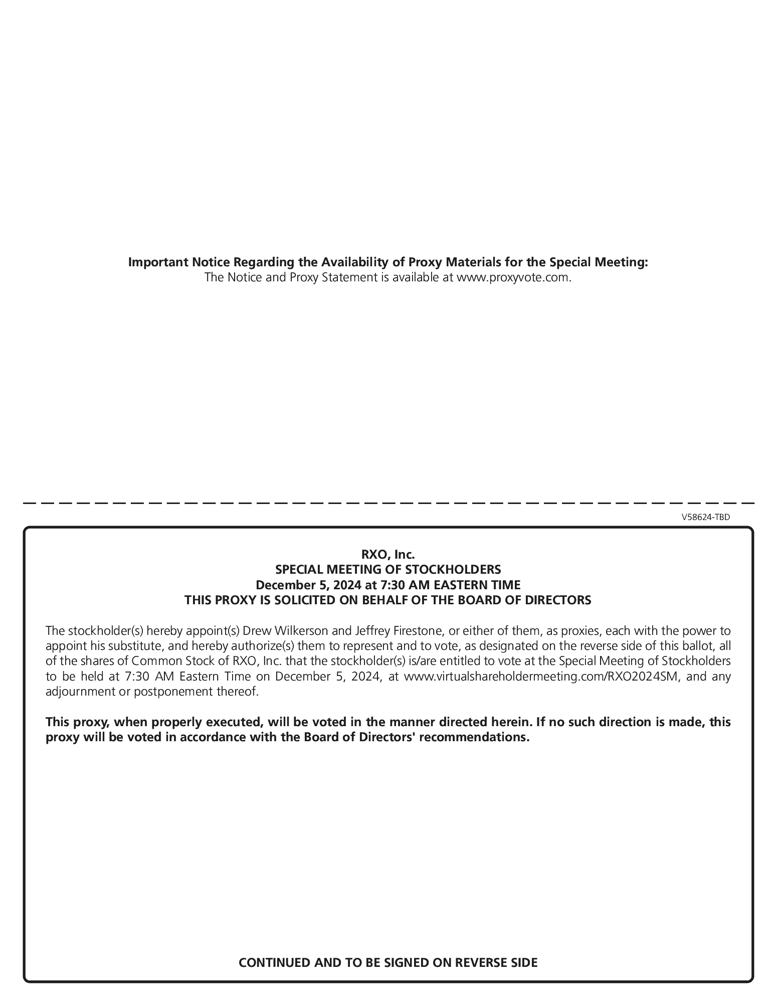 If you are a registered stockholder (i.e., you hold your shares in your own name through our transfer agent, Equiniti Trust Company LLC (formerly American Stock Transfer & Trust Company, LLC), and not through a broker, bank, or other nominee that holds shares for your account in “street name”), you may vote by proxy via the Internet, by telephone, or by mail by following the instructions provided on the proxy card. Proxies submitted by telephone or through the Internet must be received by 11:59 p.m., Eastern Time, on December 4, 2024. Please see the proxy card provided to you for instructions on how to submit your proxy by telephone or the Internet. Stockholders of record who attend the Special Meeting may vote by logging into the virtual meeting at www.virtualshareholdermeeting.com/RXO2024SM. We encourage you to log on 15 minutes prior to the start of the Special Meeting.