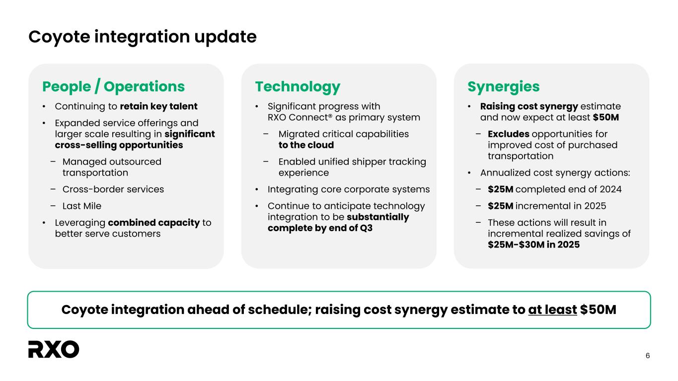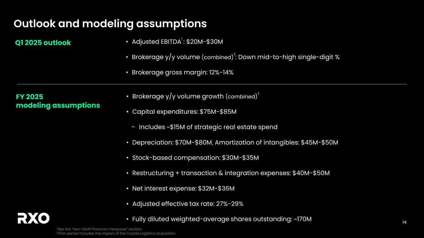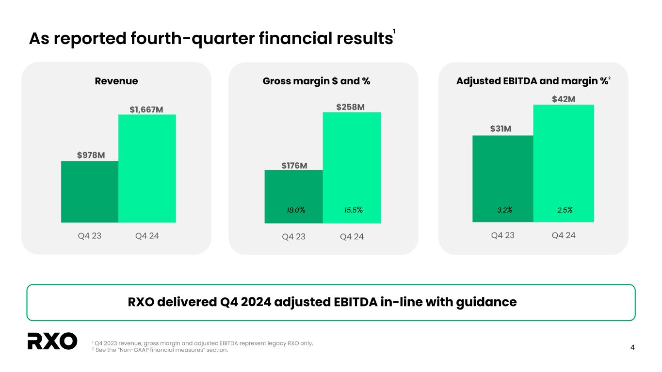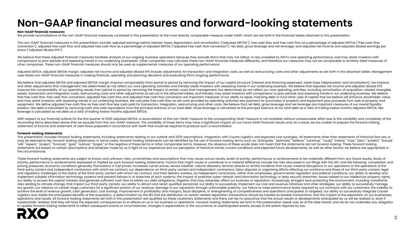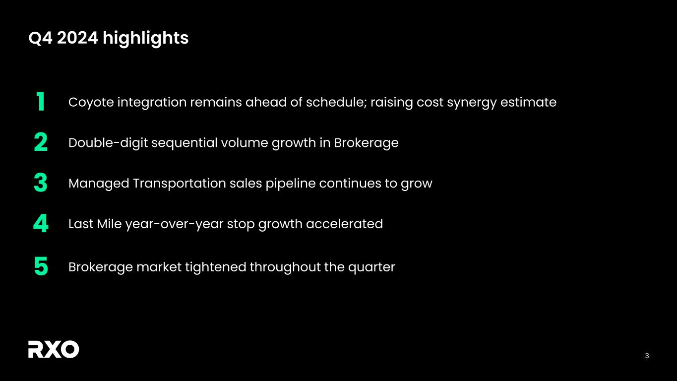 2 Non-GAAP financial measures and forward-looking statements Non-GAAP financial measures We provide reconciliations of the non-GAAP financial measures contained in this presentation to the most directly comparable measure under GAAP, which are set forth in the financial tables attached to this presentation. The non-GAAP financial measures in this presentation include: adjusted earnings before interest, taxes, depreciation and amortization (“adjusted EBITDA”); free cash flow and free cash flow as a percentage of adjusted EBITDA (“free cash flow conversion”); adjusted free cash flow and adjusted free cash flow as a percentage of adjusted EBITDA (“adjusted free cash flow conversion”); net debt, gross leverage and net leverage; and adjusted net income and adjusted diluted earnings per share (“adjusted diluted EPS”). We believe that these adjusted financial measures facilitate analysis of our ongoing business operations because they exclude items that may not reflect, or are unrelated to, RXO’s core operating performance, and may assist investors with comparisons to prior periods and assessing trends in our underlying businesses. Other companies may calculate these non-GAAP financial measures differently, and therefore our measures may not be comparable to similarly titled measures of other companies. These non-GAAP financial measures should only be used as supplemental measures of our operating performance. Adjusted EBITDA, adjusted EBITDA margin, adjusted net income and adjusted diluted EPS include adjustments for transaction and integration costs, as well as restructuring costs and other adjustments as set forth in the attached tables. Management uses these non-GAAP financial measures in making financial, operating and planning decisions and evaluating RXO’s ongoing performance. We believe that adjusted EBITDA and adjusted EBITDA margin improve comparability from period to period by removing the impact of our capital structure (interest and financing expenses), asset base (depreciation and amortization), tax impacts and other adjustments that management has determined do not reflect our core operating activities and thereby assist investors with assessing trends in our underlying business. We believe that adjusted net income and adjusted diluted EPS improve the comparability of our operating results from period to period by removing the impact of certain costs that management has determined do not reflect our core operating activities, including amortization of acquisition-related intangible assets, transaction and integration costs, restructuring costs and other adjustments as set out in the attached tables, and thereby may assist investors with comparisons to prior periods and assessing trends in our underlying business. We believe that free cash flow, free cash flow conversion, adjusted free cash flow and adjusted free cash flow conversion are important measures of our ability to repay maturing debt or fund other uses of capital that we believe will enhance stockholder value, and may assist investors with assessing trends in our underlying business. We calculate free cash flow as net cash provided by operating activities less payment for purchases of property and equipment plus proceeds from sale of property and equipment. We define adjusted free cash flow as free cash flow less cash paid for transaction, integration, restructuring and other costs. We believe that net debt, gross leverage and net leverage are important measures of our overall liquidity position. Net debt is calculated by removing cash and cash equivalents from the principal balance of our total debt. Gross leverage is calculated as the principal balance of our total debt as a ratio of trailing twelve months adjusted EBITDA. Net leverage is calculated as net debt as a ratio of trailing twelve months adjusted EBITDA. With respect to our financial outlook for the first quarter of 2025 adjusted EBITDA, a reconciliation of this non-GAAP measure to the corresponding GAAP measure is not available without unreasonable effort due to the variability and complexity of the reconciling items described above that we exclude from this non-GAAP measure. The variability of these items may have a significant impact on our future GAAP financial results and, as a result, we are unable to prepare the forward-looking statement of income and statement of cash flows prepared in accordance with GAAP that would be required to produce such a reconciliation. Forward-looking statements This presentation includes forward-looking statements, including statements relating to our outlook and 2025 assumptions, integration with Coyote Logistics and expected cost synergies. All statements other than statements of historical fact are, or may be deemed to be, forward-looking statements. In some cases, forward-looking statements can be identified by the use of forward-looking terms such as "anticipate," "estimate," "believe," "continue," "could," "intend," "may," "plan,“ "predict," "should," "will," "expect," "project," "forecast," "goal," "outlook," "target,” or the negative of these terms or other comparable terms. However, the absence of these words does not mean that the statements are not forward-looking. These forward-looking statements are based on certain assumptions and analyses made by us in light of our experience and our perception of historical trends, current conditions and expected future developments, as well as other factors we believe are appropriate in the circumstances. These forward-looking statements are subject to known and unknown risks, uncertainties and assumptions that may cause actual results, levels of activity, performance, or achievements to be materially different from any future results, levels of activity, performance or achievements expressed or implied by such forward-looking statements. Factors that might cause or contribute to a material difference include the risks discussed in our filings with t