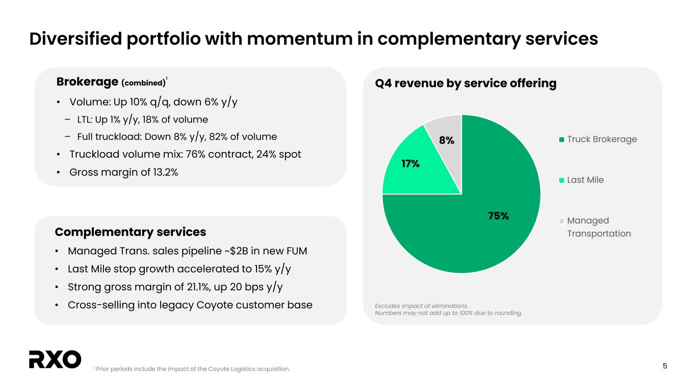 3 Q4 2024 highlights 1 Coyote integration remains ahead of schedule; raising cost synergy estimate 2 Double-digit sequential volume growth in Brokerage 3 Managed Transportation sales pipeline continues to grow 4 Last Mile year-over-year stop growth accelerated 5 Brokerage market tightened throughout the quarter