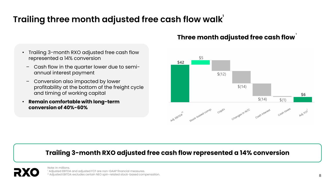 7 Adjusted EPS bridge Earnings per share Q4-24 Q4-23 GAAP diluted EPS $(0.12) $0.02 Amortization of intangible assets 0.10 0.03 Transaction, integration and restructuring costs 0.20 0.03 Tax associated with adjustments above1 and discrete tax item (0.12) (0.02) Adjusted diluted EPS2 $0.06 $0.06 RXO reported Q4 2024 adjusted diluted EPS of $0.06 1 The tax impact of non-GAAP adjustments represents the tax benefit (expense) calculated using the applicable statutory tax rate that would have been incurred had these adjustments been excluded from net income (loss). Our estimated tax rate on non-GAAP adjustments may differ from our GAAP tax rate due to differences in the methodologies applied. 2 See the “Non-GAAP financial measures” section.
