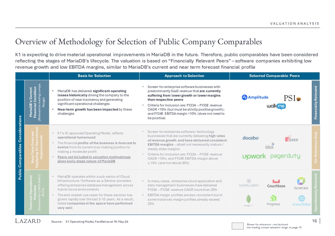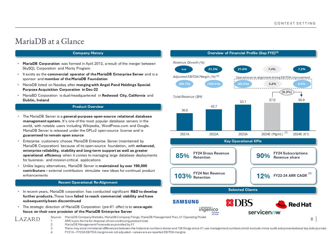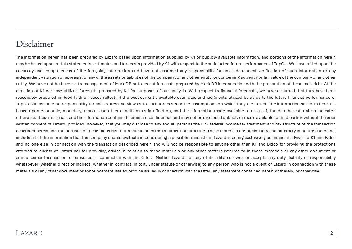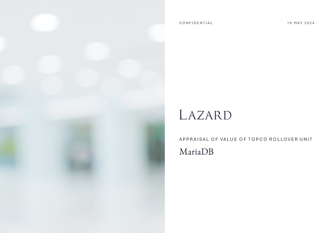 LLC (“K1”), a US-based investment firm primarily focused on the technology sector with AUM of ~$15 billion Lazard has been engaged by K1 on its take-private of MariaDB plc (“MariaDB” or “the Company”, NYSE: MRDB), a US-listed company domiciled