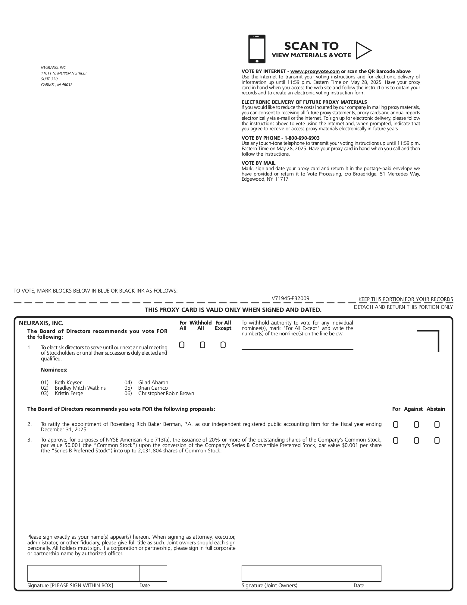 If you have questions about voting your shares, please contact Timothy Henrichs at Neuraxis, Inc., at 11611 N. Meridian St, Suite 330, Carmel, IN 46032, telephone number (812) 689-0791, email: thenrichs@neuraxis.com.