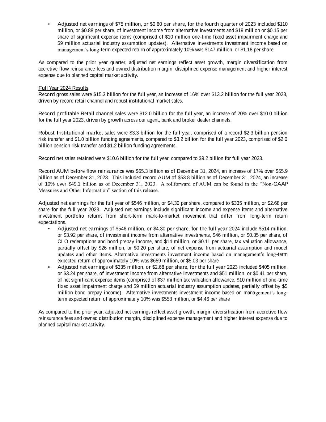 • Adjusted net earnings of $75 million, or $0.60 per share, for the fourth quarter of 2023 included $110 million, or $0.88 per share, of investment income from alternative investments and $19 million or $0.15 per share of significant expense items (comprised of $10 million one-time fixed asset impairment charge and $9 million actuarial industry assumption updates). Alternative investments investment income based on management’s long-term expected return of approximately 10% was $147 million, or $1.18 per share As compared to the prior year quarter, adjusted net earnings reflect asset growth, margin diversification from accretive flow reinsurance fees and owned distribution margin, disciplined expense management and higher interest expense due to planned capital market activity. Full Year 2024 Results Record gross sales were $15.3 billion for the full year, an increase of 16% over $13.2 billion for the full year 2023, driven by record retail channel and robust institutional market sales. Record profitable Retail channel sales were $12.0 billion for the full year, an increase of 20% over $10.0 billion for the full year 2023, driven by growth across our agent, bank and broker dealer channels. Robust Institutional market sales were $3.3 billion for the full year, comprised of a record $2.3 billion pension risk transfer and $1.0 billion funding agreements, compared to $3.2 billion for the full year 2023, comprised of $2.0 billion pension risk transfer and $1.2 billion funding agreements. Record net sales retained were $10.6 billion for the full year, compared to $9.2 billion for full year 2023. Record AUM before flow reinsurance was $65.3 billion as of December 31, 2024, an increase of 17% over $55.9 billion as of December 31, 2023. This included record AUM of $53.8 billion as of December 31, 2024, an increase of 10% over $49.1 billion as of December 31, 2023. A rollforward of AUM can be found in the “Non-GAAP Measures and Other Information” section of this release. Adjusted net earnings for the full year of $546 million, or $4.30 per share, compared to $335 million, or $2.68 per share for the full year 2023. Adjusted net earnings include significant income and expense items and alternative investment portfolio returns from short-term mark-to-market movement that differ from long-term return expectations. • Adjusted net earnings of $546 million, or $4.30 per share, for the full year 2024 include $514 million, or $3.92 per share, of investment income from alternative investments, $46 million, or $0.35 per share, of CLO redemptions and bond prepay income, and $14 million, or $0.11 per share, tax valuation allowance, partially offset by $26 million, or $0.20 per share, of net expense from actuarial assumption and model updates and other items. Alternative investments investment income based on management’s long-term expected return of approximately 10% was $659 million, or $5.03 per share • Adjusted net earnings of $335 million, or $2.68 per share, for the full year 2023 included $405 million, or $3.24 per share, of investment income from alternative investments and $51 million, or $0.41 per share, of net significant expense items (comprised of $37 million tax valuation allowance, $10 million of one-time fixed asset impairment charge and $9 million actuarial industry assumption updates, partially offset by $5 million bond prepay income). Alternative investments investment income based on management’s long- term expected return of approximately 10% was $558 million, or $4.46 per share As compared to the prior year, adjusted net earnings reflect asset growth, margin diversification from accretive flow reinsurance fees and owned distribution margin, disciplined expense management and higher interest expense due to planned capital market activity.