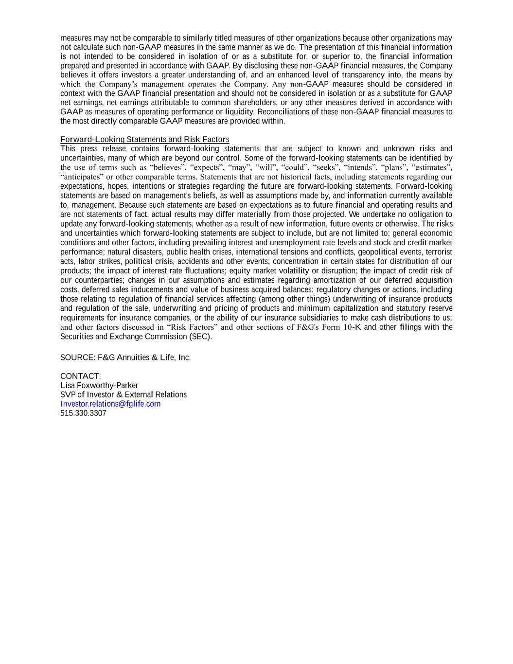 measures may not be comparable to similarly titled measures of other organizations because other organizations may not calculate such non-GAAP measures in the same manner as we do. The presentation of this financial information is not intended to be considered in isolation of or as a substitute for, or superior to, the financial information prepared and presented in accordance with GAAP. By disclosing these non-GAAP financial measures, the Company believes it offers investors a greater understanding of, and an enhanced level of transparency into, the means by which the Company’s management operates the Company. Any non-GAAP measures should be considered in context with the GAAP financial presentation and should not be considered in isolation or as a substitute for GAAP net earnings, net earnings attributable to common shareholders, or any other measures derived in accordance with GAAP as measures of operating performance or liquidity. Reconciliations of these non-GAAP financial measures to the most directly comparable GAAP measures are provided within. Forward-Looking Statements and Risk Factors This press release contains forward-looking statements that are subject to known and unknown risks and uncertainties, many of which are beyond our control. Some of the forward-looking statements can be identified by the use of terms such as “believes”, “expects”, “may”, “will”, “could”, “seeks”, “intends”, “plans”, “estimates”, “anticipates” or other comparable terms. Statements that are not historical facts, including statements regarding our expectations, hopes, intentions or strategies regarding the future are forward-looking statements. Forward-looking statements are based on management's beliefs, as well as assumptions made by, and information currently available to, management. Because such statements are based on expectations as to future financial and operating results and are not statements of fact, actual results may differ materially from those projected. We undertake no obligation to update any forward-looking statements, whether as a result of new information, future events or otherwise. The risks and uncertainties which forward-looking statements are subject to include, but are not limited to: general economic conditions and other factors, including prevailing interest and unemployment rate levels and stock and credit market performance; natural disasters, public health crises, international tensions and conflicts, geopolitical events, terrorist acts, labor strikes, political crisis, accidents and other events; concentration in certain states for distribution of our products; the impact of interest rate fluctuations; equity market volatility or disruption; the impact of credit risk of our counterparties; changes in our assumptions and estimates regarding amortization of our deferred acquisition costs, deferred sales inducements and value of business acquired balances; regulatory changes or actions, including those relating to regulation of financial services affecting (among other things) underwriting of insurance products and regulation of the sale, underwriting and pricing of products and minimum capitalization and statutory reserve requirements for insurance companies, or the ability of our insurance subsidiaries to make cash distributions to us; and other factors discussed in “Risk Factors” and other sections of F&G's Form 10-K and other filings with the Securities and Exchange Commission (SEC). SOURCE: F&G Annuities & Life, Inc. CONTACT: Lisa Foxworthy-Parker SVP of Investor & External Relations Investor.relations@fglife.com 515.330.3307