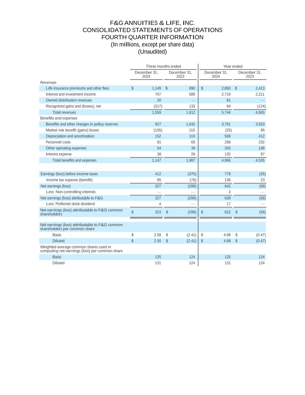 F&G ANNUITIES & LIFE, INC. CONSOLIDATED STATEMENTS OF OPERATIONS FOURTH QUARTER INFORMATION (In millions, except per share data) (Unaudited) Three months ended Year ended December 31, 2024 December 31, 2023 December 31, 2024 December 31, 2023 Revenues Life insurance premiums and other fees $ 1,149 $ 890 $ 2,860 $ 2,413 Interest and investment income 707 589 2,719 2,211 Owned distribution revenues 20 — 81 — Recognized gains and (losses), net (317) 133 84 (124) Total revenues 1,559 1,612 5,744 4,500 Benefits and expenses Benefits and other changes in policy reserves 927 1,632 3,791 3,553 Market risk benefit (gains) losses (105) 115 (25) 95 Depreciation and amortization 152 110 569 412 Personnel costs 81 65 296 232 Other operating expenses 54 39 203 146 Interest expense 38 26 132 97 Total benefits and expenses 1,147 1,987 4,966 4,535 Earnings (loss) before income taxes 412 (375) 778 (35) Income tax expense (benefit) 85 (76) 136 23 Net earnings (loss) 327 (299) 642 (58) Less: Non-controlling interests — — 3 — Net earnings (loss) attributable to F&G 327 (299) 639 (58) Less: Preferred stock dividend 4 — 17 — Net earnings (loss) attributable to F&G common shareholders $ 323 $ (299) $ 622 $ (58) Net earnings (loss) attributable to F&G common shareholders per common share Basic $ 2.58 $ (2.41) $ 4.98 $ (0.47) Diluted $ 2.50 $ (2.41) $ 4.88 $ (0.47) Weighted average common shares used in computing net earnings (loss) per common share Basic 125 124 125 124 Diluted 131 124 131 124
