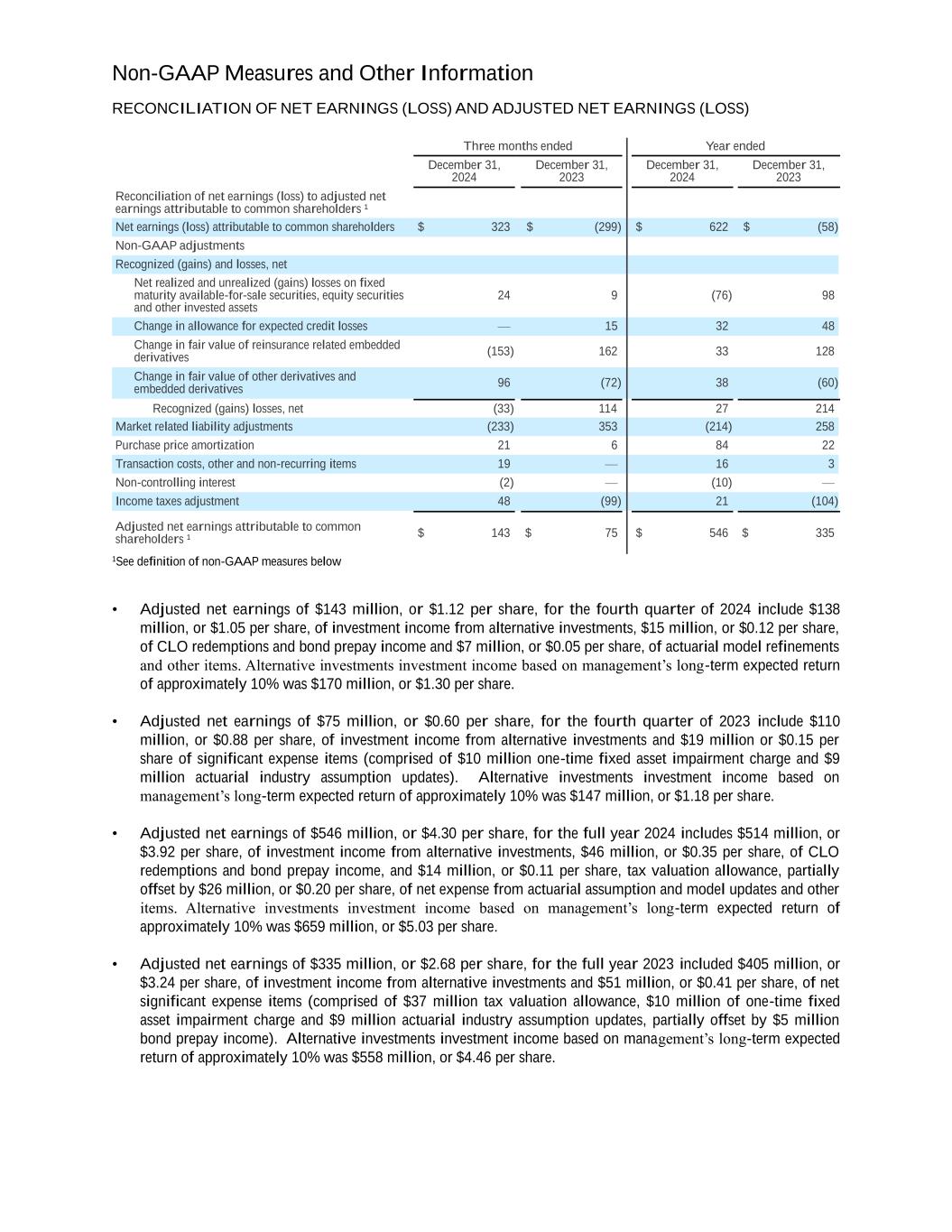 Non-GAAP Measures and Other Information RECONCILIATION OF NET EARNINGS (LOSS) AND ADJUSTED NET EARNINGS (LOSS) Three months ended Year ended December 31, 2024 December 31, 2023 December 31, 2024 December 31, 2023 Reconciliation of net earnings (loss) to adjusted net earnings attributable to common shareholders ¹ Net earnings (loss) attributable to common shareholders $ 323 $ (299) $ 622 $ (58) Non-GAAP adjustments Recognized (gains) and losses, net Net realized and unrealized (gains) losses on fixed maturity available-for-sale securities, equity securities and other invested assets 24 9 (76) 98 Change in allowance for expected credit losses — 15 32 48 Change in fair value of reinsurance related embedded derivatives (153) 162 33 128 Change in fair value of other derivatives and embedded derivatives 96 (72) 38 (60) Recognized (gains) losses, net (33) 114 27 214 Market related liability adjustments (233) 353 (214) 258 Purchase price amortization 21 6 84 22 Transaction costs, other and non-recurring items 19 — 16 3 Non-controlling interest (2) — (10) — Income taxes adjustment 48 (99) 21 (104) Adjusted net earnings attributable to common shareholders ¹ $ 143 $ 75 $ 546 $ 335 1See definition of non-GAAP measures below • Adjusted net earnings of $143 million, or $1.12 per share, for the fourth quarter of 2024 include $138 million, or $1.05 per share, of investment income from alternative investments, $15 million, or $0.12 per share, of CLO redemptions and bond prepay income and $7 million, or $0.05 per share, of actuarial model refinements and other items. Alternative investments investment income based on management’s long-term expected return of approximately 10% was $170 million, or $1.30 per share. • Adjusted net earnings of $75 million, or $0.60 per share, for the fourth quarter of 2023 include $110 million, or $0.88 per share, of investment income from alternative investments and $19 million or $0.15 per share of significant expense items (comprised of $10 million one-time fixed asset impairment charge and $9 million actuarial industry assumption updates). Alternative investments investment income based on management’s long-term expected return of approximately 10% was $147 million, or $1.18 per share. • Adjusted net earnings of $546 million, or $4.30 per share, for the full year 2024 includes $514 million, or $3.92 per share, of investment income from alternative investments, $46 million, or $0.35 per share, of CLO redemptions and bond prepay income, and $14 million, or $0.11 per share, tax valuation allowance, partially offset by $26 million, or $0.20 per share, of net expense from actuarial assumption and model updates and other items. Alternative investments investment income based on management’s long-term expected return of approximately 10% was $659 million, or $5.03 per share. • Adjusted net earnings of $335 million, or $2.68 per share, for the full year 2023 included $405 million, or $3.24 per share, of investment income from alternative investments and $51 million, or $0.41 per share, of net significant expense items (comprised of $37 million tax valuation allowance, $10 million of one-time fixed asset impairment charge and $9 million actuarial industry assumption updates, partially offset by $5 million bond prepay income). Alternative investments investment income based on management’s long-term expected return of approximately 10% was $558 million, or $4.46 per share.