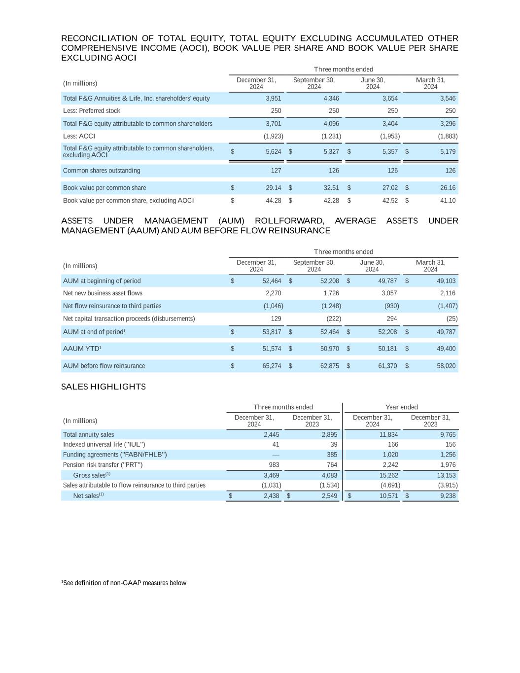 RECONCILIATION OF TOTAL EQUITY, TOTAL EQUITY EXCLUDING ACCUMULATED OTHER COMPREHENSIVE INCOME (AOCI), BOOK VALUE PER SHARE AND BOOK VALUE PER SHARE EXCLUDING AOCI Three months ended (In millions) December 31, 2024 September 30, 2024 June 30, 2024 March 31, 2024 Total F&G Annuities & Life, Inc. shareholders' equity 3,951 4,346 3,654 3,546 Less: Preferred stock 250 250 250 250 Total F&G equity attributable to common shareholders 3,701 4,096 3,404 3,296 Less: AOCI (1,923) (1,231) (1,953) (1,883) Total F&G equity attributable to common shareholders, excluding AOCI $ 5,624 $ 5,327 $ 5,357 $ 5,179 Common shares outstanding 127 126 126 126 Book value per common share $ 29.14 $ 32.51 $ 27.02 $ 26.16 Book value per common share, excluding AOCI $ 44.28 $ 42.28 $ 42.52 $ 41.10 ASSETS UNDER MANAGEMENT (AUM) ROLLFORWARD, AVERAGE ASSETS UNDER MANAGEMENT (AAUM) AND AUM BEFORE FLOW REINSURANCE Three months ended (In millions) December 31, 2024 September 30, 2024 June 30, 2024 March 31, 2024 AUM at beginning of period $ 52,464 $ 52,208 $ 49,787 $ 49,103 Net new business asset flows 2,270 1,726 3,057 2,116 Net flow reinsurance to third parties (1,046) (1,248) (930) (1,407) Net capital transaction proceeds (disbursements) 129 (222) 294 (25) AUM at end of period¹ $ 53,817 $ 52,464 $ 52,208 $ 49,787 AAUM YTD¹ $ 51,574 $ 50,970 $ 50,181 $ 49,400 AUM before flow reinsurance $ 65,274 $ 62,875 $ 61,370 $ 58,020 SALES HIGHLIGHTS Three months ended Year ended (In millions) December 31, 2024 December 31, 2023 December 31, 2024 December 31, 2023 Total annuity sales 2,445 2,895 11,834 9,765 Indexed universal life ("IUL") 41 39 166 156 Funding agreements ("FABN/FHLB") — 385 1,020 1,256 Pension risk transfer ("PRT") 983 764 2,242 1,976 Gross sales(1) 3,469 4,083 15,262 13,153 Sales attributable to flow reinsurance to third parties (1,031) (1,534) (4,691) (3,915) Net sales(1) $ 2,438 $ 2,549 $ 10,571 $ 9,238 1See definition of non-GAAP measures below