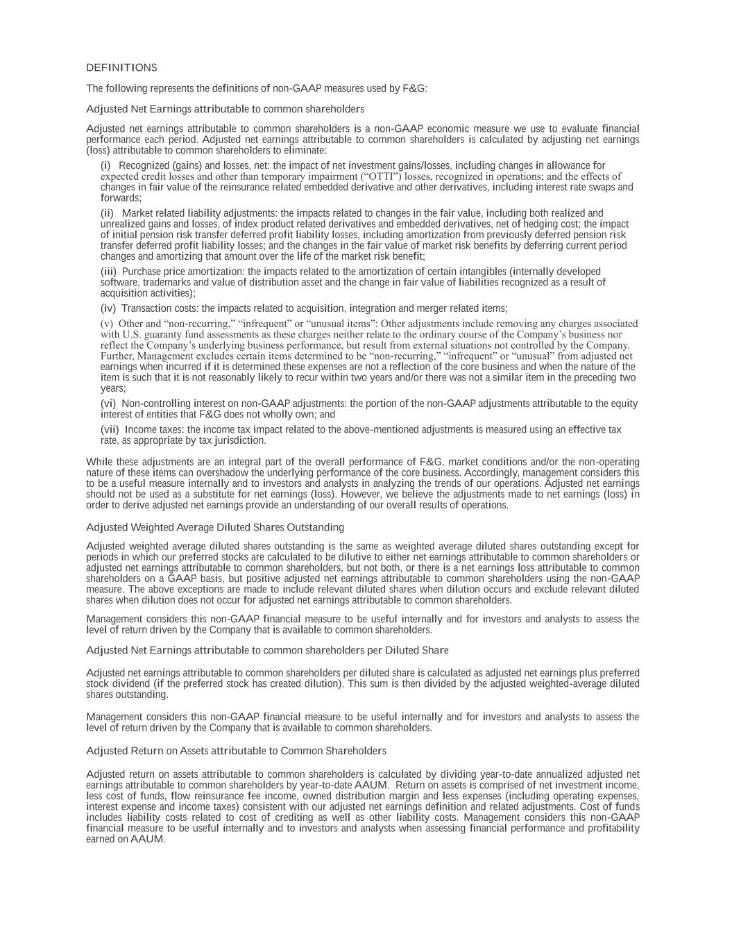 DEFINITIONS The following represents the definitions of non-GAAP measures used by F&G: Adjusted Net Earnings attributable to common shareholders Adjusted net earnings attributable to common shareholders is a non-GAAP economic measure we use to evaluate financial performance each period. Adjusted net earnings attributable to common shareholders is calculated by adjusting net earnings (loss) attributable to common shareholders to eliminate: (i) Recognized (gains) and losses, net: the impact of net investment gains/losses, including changes in allowance for expected credit losses and other than temporary impairment (“OTTI”) losses, recognized in operations; and the effects of changes in fair value of the reinsurance related embedded derivative and other derivatives, including interest rate swaps and forwards; (ii) Market related liability adjustments: the impacts related to changes in the fair value, including both realized and unrealized gains and losses, of index product related derivatives and embedded derivatives, net of hedging cost; the impact of initial pension risk transfer deferred profit liability losses, including amortization from previously deferred pension risk transfer deferred profit liability losses; and the changes in the fair value of market risk benefits by deferring current period changes and amortizing that amount over the life of the market risk benefit; (iii) Purchase price amortization: the impacts related to the amortization of certain intangibles (internally developed software, trademarks and value of distribution asset and the change in fair value of liabilities recognized as a result of acquisition activities); (iv) Transaction costs: the impacts related to acquisition, integration and merger related items; (v) Other and “non-recurring,” “infrequent” or “unusual items”: Other adjustments include removing any charges associated with U.S. guaranty fund assessments as these charges neither relate to the ordinary course of the Company’s business nor reflect the Company’s underlying business performance, but result from external situations not controlled by the Company. Further, Management excludes certain items determined to be “non-recurring,” “infrequent” or “unusual” from adjusted net earnings when incurred if it is determined these expenses are not a reflection of the core business and when the nature of the item is such that it is not reasonably likely to recur within two years and/or there was not a similar item in the preceding two years; (vi) Non-controlling interest on non-GAAP adjustments: the portion of the non-GAAP adjustments attributable to the equity interest of entities that F&G does not wholly own; and (vii) Income taxes: the income tax impact related to the above-mentioned adjustments is measured using an effective tax rate, as appropriate by tax jurisdiction. While these adjustments are an integral part of the overall performance of F&G, market conditions and/or the non-operating nature of these items can overshadow the underlying performance of the core business. Accordingly, management considers this to be a useful measure internally and to investors and analysts in analyzing the trends of our operations. Adjusted net earnings should not be used as a substitute for net earnings (loss). However, we believe the adjustments made to net earnings (loss) in order to derive adjusted net earnings provide an understanding of our overall results of operations. Adjusted Weighted Average Diluted Shares Outstanding Adjusted weighted average diluted shares outstanding is the same as weighted average diluted shares outstanding except for periods in which our preferred stocks are calculated to be dilutive to either net earnings attributable to common shareholders or adjusted net earnings attributable to common shareholders, but not both, or there is a net earnings loss attributable to common shareholders on a GAAP basis, but positive adjusted net earnings attributable to common shareholders using the non-GAAP measure. The above exceptions are made to include relevant diluted shares when dilution occurs and exclude relevant diluted shares when dilution does not occur for adjusted net earnings attributable to common shareholders. Management considers this non-GAAP financial measure to be useful internally and for investors and analysts to assess the level of return driven by the Company that is available to common shareholders. Adjusted Net Earnings attributable to common shareholders per Diluted Share Adjusted net earnings attributable to common shareholders per diluted share is calculated as adjusted net earnings plus preferred stock dividend (if the preferred stock has created dilution). This sum is then divided by the adjusted weighted-average diluted shares outstanding. Management considers this non-GAAP financial measure to be useful internally and for investors and analysts to assess the level of return driven by the Company that is available to common shareholders. Adjusted Return on Assets attributable to Common Shareholders Adjusted return on assets attributable to common shareholders is calculated by dividing year-to-date annualized adjusted net earnings attributable to common shareholders by year-to-date AAUM. Return on assets is comprised of net investment income, less cost of funds, flow reinsurance fee income, owned distribution margin and less expenses (including operating expenses, interest expense and income taxes) consistent with our adjusted net earnings definition and related adjustments. Cost of funds includes liability costs related to cost of crediting as well as other liability costs. Management considers this non-GAAP financial measure to be useful internally and to investors and analysts when assessing financial performance and profitability earned on AAUM.