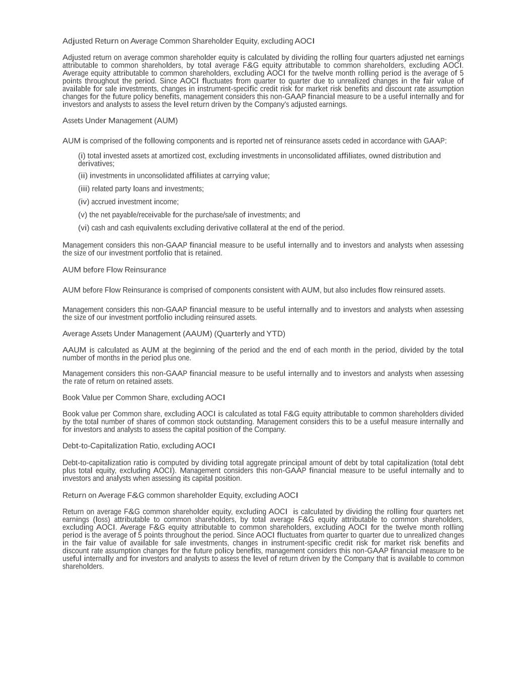 Adjusted Return on Average Common Shareholder Equity, excluding AOCI Adjusted return on average common shareholder equity is calculated by dividing the rolling four quarters adjusted net earnings attributable to common shareholders, by total average F&G equity attributable to common shareholders, excluding AOCI. Average equity attributable to common shareholders, excluding AOCI for the twelve month rolling period is the average of 5 points throughout the period. Since AOCI fluctuates from quarter to quarter due to unrealized changes in the fair value of available for sale investments, changes in instrument-specific credit risk for market risk benefits and discount rate assumption changes for the future policy benefits, management considers this non-GAAP financial measure to be a useful internally and for investors and analysts to assess the level return driven by the Company's adjusted earnings. Assets Under Management (AUM) AUM is comprised of the following components and is reported net of reinsurance assets ceded in accordance with GAAP: (i) total invested assets at amortized cost, excluding investments in unconsolidated affiliates, owned distribution and derivatives; (ii) investments in unconsolidated affiliates at carrying value; (iii) related party loans and investments; (iv) accrued investment income; (v) the net payable/receivable for the purchase/sale of investments; and (vi) cash and cash equivalents excluding derivative collateral at the end of the period. Management considers this non-GAAP financial measure to be useful internally and to investors and analysts when assessing the size of our investment portfolio that is retained. AUM before Flow Reinsurance AUM before Flow Reinsurance is comprised of components consistent with AUM, but also includes flow reinsured assets. Management considers this non-GAAP financial measure to be useful internally and to investors and analysts when assessing the size of our investment portfolio including reinsured assets. Average Assets Under Management (AAUM) (Quarterly and YTD) AAUM is calculated as AUM at the beginning of the period and the end of each month in the period, divided by the total number of months in the period plus one. Management considers this non-GAAP financial measure to be useful internally and to investors and analysts when assessing the rate of return on retained assets. Book Value per Common Share, excluding AOCI Book value per Common share, excluding AOCI is calculated as total F&G equity attributable to common shareholders divided by the total number of shares of common stock outstanding. Management considers this to be a useful measure internally and for investors and analysts to assess the capital position of the Company. Debt-to-Capitalization Ratio, excluding AOCI Debt-to-capitalization ratio is computed by dividing total aggregate principal amount of debt by total capitalization (total debt plus total equity, excluding AOCI). Management considers this non-GAAP financial measure to be useful internally and to investors and analysts when assessing its capital position. Return on Average F&G common shareholder Equity, excluding AOCI Return on average F&G common shareholder equity, excluding AOCI is calculated by dividing the rolling four quarters net earnings (loss) attributable to common shareholders, by total average F&G equity attributable to common shareholders, excluding AOCI. Average F&G equity attributable to common shareholders, excluding AOCI for the twelve month rolling period is the average of 5 points throughout the period. Since AOCI fluctuates from quarter to quarter due to unrealized changes in the fair value of available for sale investments, changes in instrument-specific credit risk for market risk benefits and discount rate assumption changes for the future policy benefits, management considers this non-GAAP financial measure to be useful internally and for investors and analysts to assess the level of return driven by the Company that is available to common shareholders.