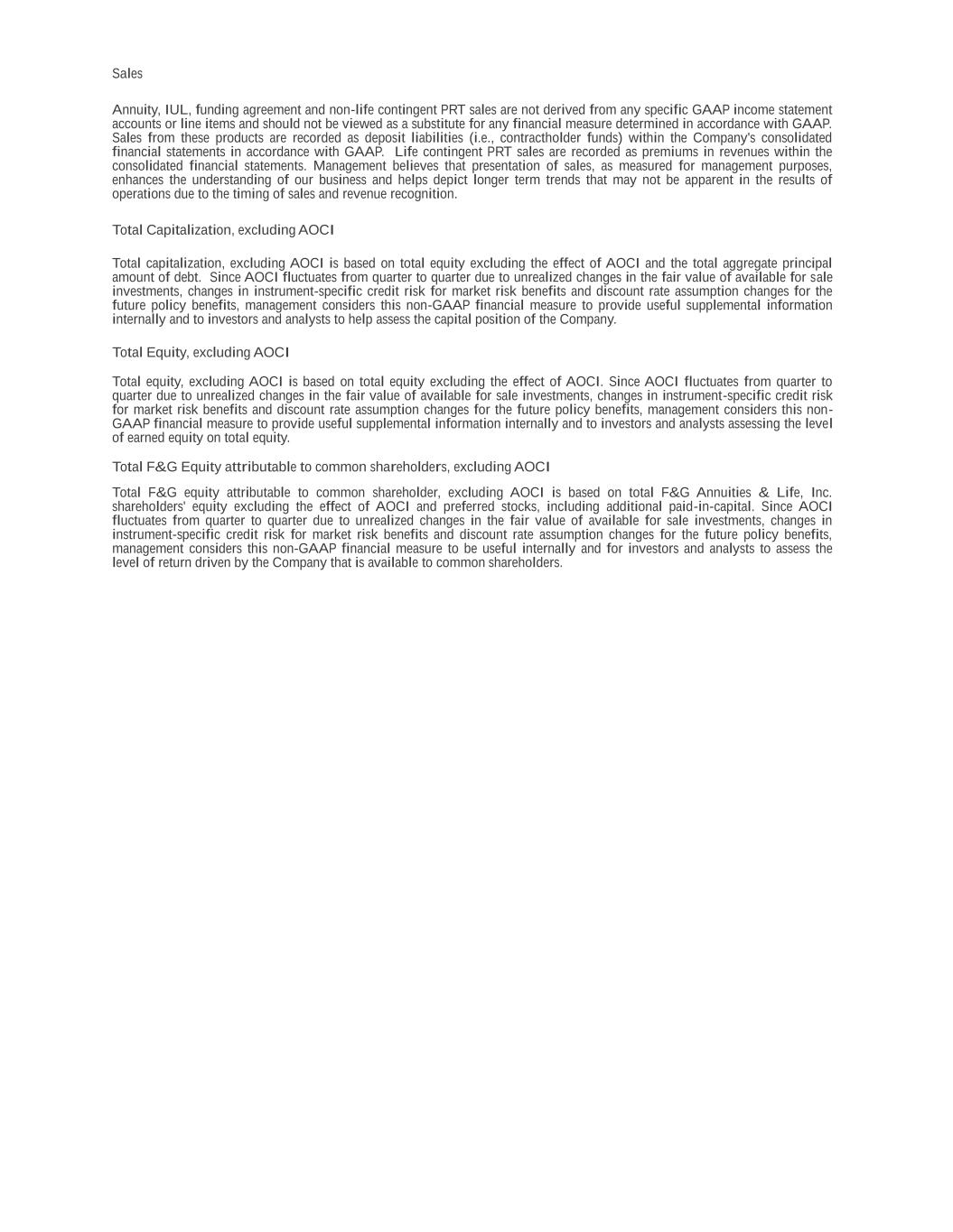 Sales Annuity, IUL, funding agreement and non-life contingent PRT sales are not derived from any specific GAAP income statement accounts or line items and should not be viewed as a substitute for any financial measure determined in accordance with GAAP. Sales from these products are recorded as deposit liabilities (i.e., contractholder funds) within the Company's consolidated financial statements in accordance with GAAP. Life contingent PRT sales are recorded as premiums in revenues within the consolidated financial statements. Management believes that presentation of sales, as measured for management purposes, enhances the understanding of our business and helps depict longer term trends that may not be apparent in the results of operations due to the timing of sales and revenue recognition. Total Capitalization, excluding AOCI Total capitalization, excluding AOCI is based on total equity excluding the effect of AOCI and the total aggregate principal amount of debt. Since AOCI fluctuates from quarter to quarter due to unrealized changes in the fair value of available for sale investments, changes in instrument-specific credit risk for market risk benefits and discount rate assumption changes for the future policy benefits, management considers this non-GAAP financial measure to provide useful supplemental information internally and to investors and analysts to help assess the capital position of the Company. Total Equity, excluding AOCI Total equity, excluding AOCI is based on total equity excluding the effect of AOCI. Since AOCI fluctuates from quarter to quarter due to unrealized changes in the fair value of available for sale investments, changes in instrument-specific credit risk for market risk benefits and discount rate assumption changes for the future policy benefits, management considers this non- GAAP financial measure to provide useful supplemental information internally and to investors and analysts assessing the level of earned equity on total equity. Total F&G Equity attributable to common shareholders, excluding AOCI Total F&G equity attributable to common shareholder, excluding AOCI is based on total F&G Annuities & Life, Inc. shareholders' equity excluding the effect of AOCI and preferred stocks, including additional paid-in-capital. Since AOCI fluctuates from quarter to quarter due to unrealized changes in the fair value of available for sale investments, changes in instrument-specific credit risk for market risk benefits and discount rate assumption changes for the future policy benefits, management considers this non-GAAP financial measure to be useful internally and for investors and analysts to assess the level of return driven by the Company that is available to common shareholders.