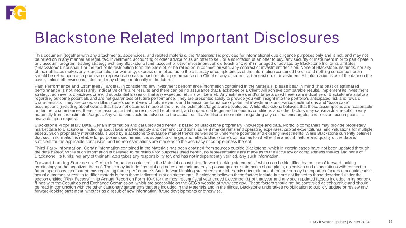 Blackstone Related Important Disclosures 38F&G Investor Update | Winter 2024 This document (together with any attachments, appendices, and related materials, the “Materials”) is provided for informational due diligence purposes only and is not, and may not be relied on in any manner as legal, tax, investment, accounting or other advice or as an offer to sell, or a solicitation of an offer to buy, any security or instrument in or to participate in any account, program, trading strategy with any Blackstone fund, account or other investment vehicle (each a “Client”) managed or advised by Blackstone Inc. or its affiliates (“Blackstone”), nor shall it or the fact of its distribution form the basis of, or be relied on in connection with, any contract or investment decision. None of Blackstone, its funds, nor any of their affiliates makes any representation or warranty, express or implied, as to the accuracy or completeness of the information contained herein and nothing contained herein should be relied upon as a promise or representation as to past or future performance of a Client or any other entity, transaction, or investment. All information is as of the date on the cover, unless otherwise indicated and may change materially in the future. Past Performance and Estimates / Targets. In considering any investment performance information contained in the Materials, please bear in mind that past or estimated performance is not necessarily indicative of future results and there can be no assurance that Blackstone or a Client will achieve comparable results, implement its investment strategy, achieve its objectives or avoid substantial losses or that any expected returns will be met. Any estimates and/or targets used herein are indicative of Blackstone’s analysis regarding outcome potentials and are not guarantees of future performance. They are presented solely to provide you with insight into the portfolio's anticipated risk and reward characteristics. They are based on Blackstone’s current view of future events and financial performance of potential investments and various estimations and “base case” assumptions (including about events that have not occurred) made at the time the estimates/targets are developed. While Blackstone believes that these assumptions are reasonable under the circumstances, there is no assurance that the results will be obtained, and unpredictable general economic conditions and other factors may cause actual results to vary materially from the estimates/targets. Any variations could be adverse to the actual results. Additional information regarding any estimations/targets, and relevant assumptions, is available upon request. Blackstone Proprietary Data. Certain information and data provided herein is based on Blackstone proprietary knowledge and data. Portfolio companies may provide proprietary market data to Blackstone, including about local market supply and demand conditions, current market rents and operating expenses, capital expenditures, and valuations for multiple assets. Such proprietary market data is used by Blackstone to evaluate market trends as well as to underwrite potential and existing investments. While Blackstone currently believes that such information is reliable for purposes used herein, it is subject to change, and reflects Blackstone’s opinion as to whether the amount, nature and quality of the data is sufficient for the applicable conclusion, and no representations are made as to the accuracy or completeness thereof. Third-Party Information. Certain information contained in the Materials has been obtained from sources outside Blackstone, which in certain cases have not been updated through the date hereof. While such information is believed to be reliable for purposes used herein, no representations are made as to the accuracy or completeness thereof and none of Blackstone, its funds, nor any of their affiliates takes any responsibility for, and has not independently verified, any such information. Forward-Looking Statements. Certain information contained in the Materials constitutes “forward-looking statements,” which can be identified by the use of forward-looking terminology or the negatives thereof. These may include financial estimates and their underlying assumptions, statements about plans, objectives and expectations with respect to future operations, and statements regarding future performance. Such forward‐looking statements are inherently uncertain and there are or may be important factors that could cause actual outcomes or results to differ materially from those indicated in such statements. Blackstone believes these factors include but are not limited to those described under the section entitled “Risk Factors” in its Annual Report on Form 10‐K for the most recent fiscal year ended December 31 of that year and any such updated factors included in its periodic filings with the Securities and Exchange Commission, which are accessible on the SEC’s website at www.sec.gov. These factors should not be construed as exhaustive and should be read in conjunction with the other cautionary statements that are included in the Materials and in the filings. Blackstone undertakes no obligation to publicly update or review any forward‐looking statement, whether as a result of new information, future developments or otherwise.