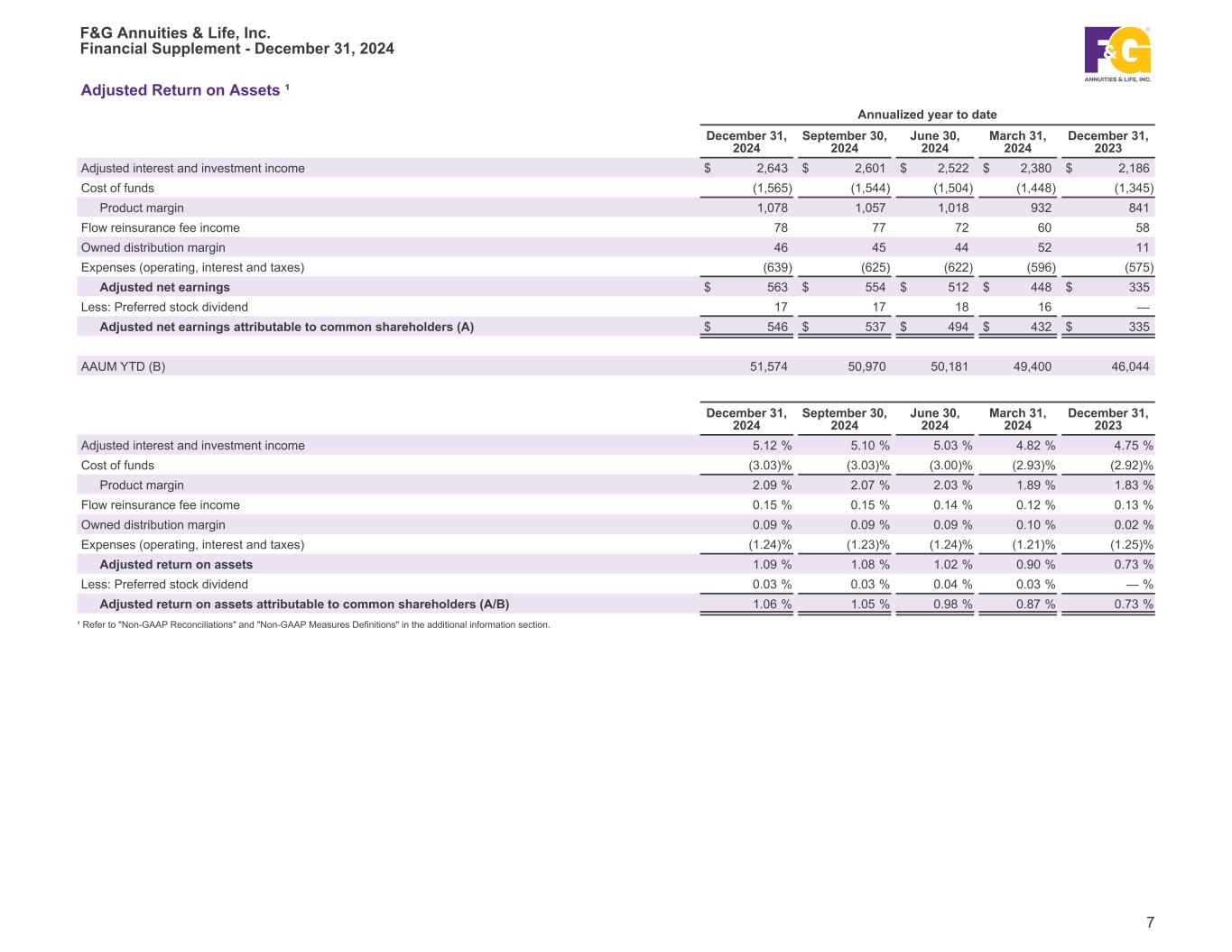 Adjusted Return on Assets ¹ Annualized year to date December 31, 2024 September 30, 2024 June 30, 2024 March 31, 2024 December 31, 2023 Adjusted interest and investment income $ 2,643 $ 2,601 $ 2,522 $ 2,380 $ 2,186 Cost of funds (1,565) (1,544) (1,504) (1,448) (1,345) Product margin 1,078 1,057 1,018 932 841 Flow reinsurance fee income 78 77 72 60 58 Owned distribution margin 46 45 44 52 11 Expenses (operating, interest and taxes) (639) (625) (622) (596) (575) Adjusted net earnings $ 563 $ 554 $ 512 $ 448 $ 335 Less: Preferred stock dividend 17 17 18 16 — Adjusted net earnings attributable to common shareholders (A) $ 546 $ 537 $ 494 $ 432 $ 335 AAUM YTD (B) 51,574 50,970 50,181 49,400 46,044 December 31, 2024 September 30, 2024 June 30, 2024 March 31, 2024 December 31, 2023 Adjusted interest and investment income 5.12 % 5.10 % 5.03 % 4.82 % 4.75 % Cost of funds (3.03) % (3.03) % (3.00) % (2.93) % (2.92) % Product margin 2.09 % 2.07 % 2.03 % 1.89 % 1.83 % Flow reinsurance fee income 0.15 % 0.15 % 0.14 % 0.12 % 0.13 % Owned distribution margin 0.09 % 0.09 % 0.09 % 0.10 % 0.02 % Expenses (operating, interest and taxes) (1.24) % (1.23) % (1.24) % (1.21) % (1.25) % Adjusted return on assets 1.09 % 1.08 % 1.02 % 0.90 % 0.73 % Less: Preferred stock dividend 0.03 % 0.03 % 0.04 % 0.03 % — % Adjusted return on assets attributable to common shareholders (A/B) 1.06 % 1.05 % 0.98 % 0.87 % 0.73 % ¹ Refer to "Non-GAAP Reconciliations" and "Non-GAAP Measures Definitions" in the additional information section. F&G Annuities & Life, Inc. Financial Supplement - December 31, 2024 7