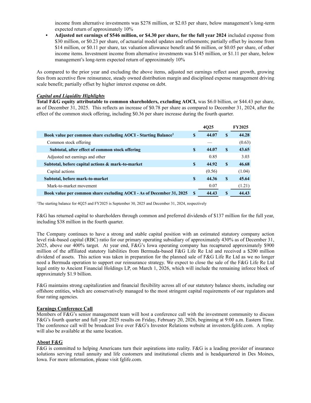 income from alternative investments was $278 million, or $2.03 per share, below management’s long-term expected return of approximately 10% • Adjusted net earnings of $546 million, or $4.30 per share, for the full year 2024 included expense from $30 million, or $0.23 per share, of actuarial model updates and refinements; partially offset by income from $14 million, or $0.11 per share, tax valuation allowance benefit and $6 million, or $0.05 per share, of other income items. Investment income from alternative investments was $145 million, or $1.11 per share, below management’s long-term expected return of approximately 10% As compared to the prior year and excluding the above items, adjusted net earnings reflect asset growth, growing fees from accretive flow reinsurance, steady owned distribution margin and disciplined expense management driving scale benefit; partially offset by higher interest expense on debt. Capital and Liquidity Highlights Total F&G equity attributable to common shareholders, excluding AOCI, was $6.0 billion, or $44.43 per share, as of December 31, 2025. This reflects an increase of $0.78 per share as compared to December 31, 2024, after the effect of the common stock offering, including $0.36 per share increase during the fourth quarter. 4Q25 FY2025 Book value per common share excluding AOCI - Starting Balance1 $ 44.07 $ 44.28 Common stock offering — (0.63) Subtotal, after effect of common stock offering $ 44.07 $ 43.65 Adjusted net earnings and other 0.85 3.03 Subtotal, before capital actions & mark-to-market $ 44.92 $ 46.68 Capital actions (0.56) (1.04) Subtotal, before mark-to-market $ 44.36 $ 45.64 Mark-to-market movement 0.07 (1.21) Book value per common share excluding AOCI - As of December 31, 2025 $ 44.43 $ 44.43 1The starting balance for 4Q25 and FY2025 is September 30, 2025 and December 31, 2024, respectively F&G has returned capital to shareholders through common and preferred dividends of $137 million for the full year, including $38 million in the fourth quarter. The Company continues to have a strong and stable capital position with an estimated statutory company action level risk-based capital (RBC) ratio for our primary operating subsidiary of approximately 430% as of December 31, 2025, above our 400% target. At year end, F&G’s Iowa operating company has recaptured approximately $900 million of the affiliated statutory liabilities from Bermuda-based F&G Life Re Ltd and received a $200 million dividend of assets. This action was taken in preparation for the planned sale of F&G Life Re Ltd as we no longer need a Bermuda operation to support our reinsurance strategy. We expect to close the sale of the F&G Life Re Ltd legal entity to Ancient Financial Holdings LP, on March 1, 2026, which will include the remaining inforce block of approximately $1.9 billion. F&G maintains strong capitalization and financial flexibility across all of our statutory balance sheets, including our offshore entities, which are conservatively managed to the most stringent capital requirements of our regulators and four rating agencies. Earnings Conference Call Members of F&G’s senior management team will host a conference call with the investment community to discuss F&G’s fourth quarter and full year 2025 results on Friday, February 20, 2026, beginning at 9:00 a.m. Eastern Time. The conference call will be broadcast live over F&G’s Investor Relations website at investors.fglife.com. A replay will also be available at the same location. About F&G F&G is committed to helping Americans turn their aspirations into reality. F&G is a leading provider of insurance solutions serving retail annuity and life customers and institutional clients and is headquartered in Des Moines, Iowa. For more information, please visit fglife.com.