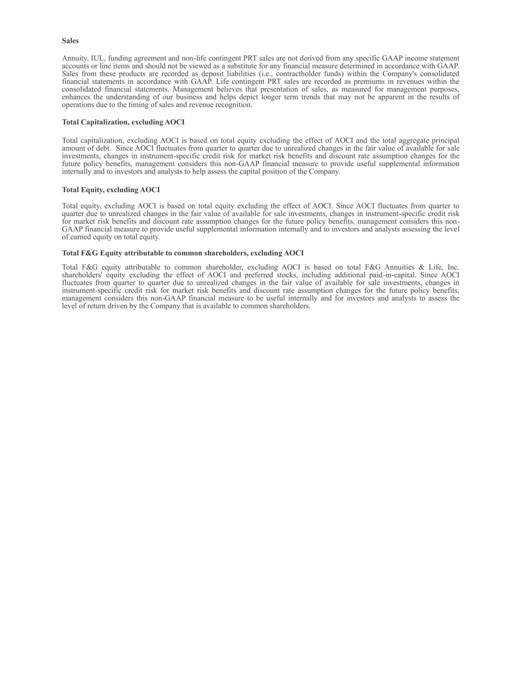 Sales Annuity, IUL, funding agreement and non-life contingent PRT sales are not derived from any specific GAAP income statement accounts or line items and should not be viewed as a substitute for any financial measure determined in accordance with GAAP. Sales from these products are recorded as deposit liabilities (i.e., contractholder funds) within the Company's consolidated financial statements in accordance with GAAP. Life contingent PRT sales are recorded as premiums in revenues within the consolidated financial statements. Management believes that presentation of sales, as measured for management purposes, enhances the understanding of our business and helps depict longer term trends that may not be apparent in the results of operations due to the timing of sales and revenue recognition. Total Capitalization, excluding AOCI Total capitalization, excluding AOCI is based on total equity excluding the effect of AOCI and the total aggregate principal amount of debt. Since AOCI fluctuates from quarter to quarter due to unrealized changes in the fair value of available for sale investments, changes in instrument-specific credit risk for market risk benefits and discount rate assumption changes for the future policy benefits, management considers this non-GAAP financial measure to provide useful supplemental information internally and to investors and analysts to help assess the capital position of the Company. Total Equity, excluding AOCI Total equity, excluding AOCI is based on total equity excluding the effect of AOCI. Since AOCI fluctuates from quarter to quarter due to unrealized changes in the fair value of available for sale investments, changes in instrument-specific credit risk for market risk benefits and discount rate assumption changes for the future policy benefits, management considers this non- GAAP financial measure to provide useful supplemental information internally and to investors and analysts assessing the level of earned equity on total equity. Total F&G Equity attributable to common shareholders, excluding AOCI Total F&G equity attributable to common shareholder, excluding AOCI is based on total F&G Annuities & Life, Inc. shareholders' equity excluding the effect of AOCI and preferred stocks, including additional paid-in-capital. Since AOCI fluctuates from quarter to quarter due to unrealized changes in the fair value of available for sale investments, changes in instrument-specific credit risk for market risk benefits and discount rate assumption changes for the future policy benefits, management considers this non-GAAP financial measure to be useful internally and for investors and analysts to assess the level of return driven by the Company that is available to common shareholders.