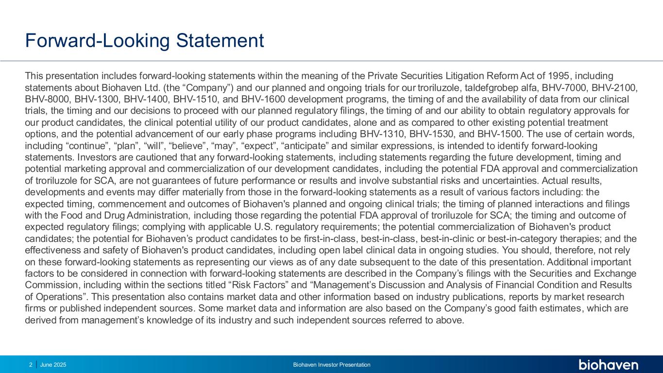 Forward-Looking Statement This presentation includes forward-looking statements within the meaning of the Private Securities Litigation Reform Act of 1995, including  statements about Biohaven Ltd. (the “Company”) and our planned and ongoing trials for our troriluzole, taldefgrobep alfa, BHV-7000, BHV-2100,  BHV-8000, BHV-1300, BHV-1400, BHV-1510, and BHV-1600 development programs, the timing of and the availability of data from our clinical  trials, the timing and our decisions to proceed with our planned regulatory filings, the timing of and our ability to obtain regulatory approvals for  our product candidates, the clinical potential utility of our product candidates, alone and as compared to other existing potential treatment  options, and the potential advancement of our early phase programs including BHV-1310, BHV-1530, and BHV-1500. The use of certain words,  including “continue”, “plan”, “will”, “believe”, “may”, “expect”, “anticipate” and similar expressions, is intended to identi fy forward-looking  statements. Investors are cautioned that any forward-looking statements, including statements regarding the future development, timing and  potential marketing approval and commercialization of our development candidates, including the potential FDA approval and commercialization  of troriluzole for SCA, are not guarantees of future performance or results and involve substantial risks and uncertainties. Actual results,  developments and events may differ materially from those in the forward-looking statements as a result of various factors including: the  expected timing, commencement and outcomes of Biohaven's planned and ongoing clinical trials; the timing of planned interactions and filings  with the Food and Drug Administration, including those regarding the potential FDA approval of troriluzole for SCA; the timing and outcome of  expected regulatory filings; complying with applicable U.S. regulatory requirements; the potential commercialization of Biohaven's product  candidates; the potential for Biohaven’s product candidates to be first-in-class, best-in-class, best-in-clinic or best-in-category therapies; and the  effectiveness and safety of Biohaven's product candidates, including open label clinical data in ongoing studies. You should, therefore, not rely  on these forward-looking statements as representing our views as of any date subsequent to the date of this presentation. Additional important  factors to be considered in connection with forward-looking statements are described in the Company’s filings with the Securities and Exchange  Commission, including within the sections titled “Risk Factors” and “Management’s Discussion and Analysis of Financial Condition and Results  of Operations”. This presentation also contains market data and other information based on industry publications, reports by market research  firms or published independent sources. Some market data and information are also based on the Company’s good faith estimates, which are  derived from management’s knowledge of its industry and such independent sources referred to above. June 2025 Biohaven Investor Presentation2